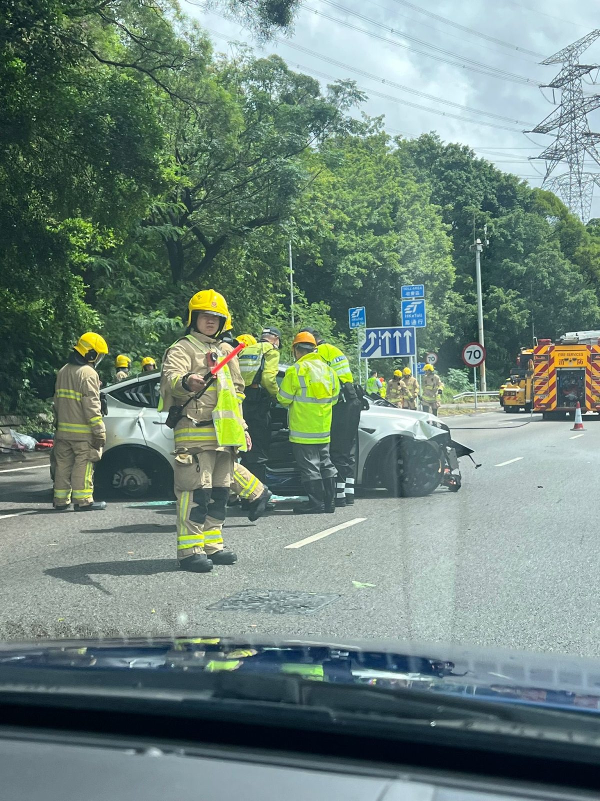 網上流傳事故現場車Cam可見,大批消防員及警員到場,多輛救護車、消防車在場戒備;而涉事Tesla車頭全毀,車尾玻璃碎裂,橫亘慢線和中線之間。現場消息指,電動車事故後一度冒煙,人員在電動車插入「應急插頭」模擬充電狀態,防止電動車繼續行駛及開喉戒備。