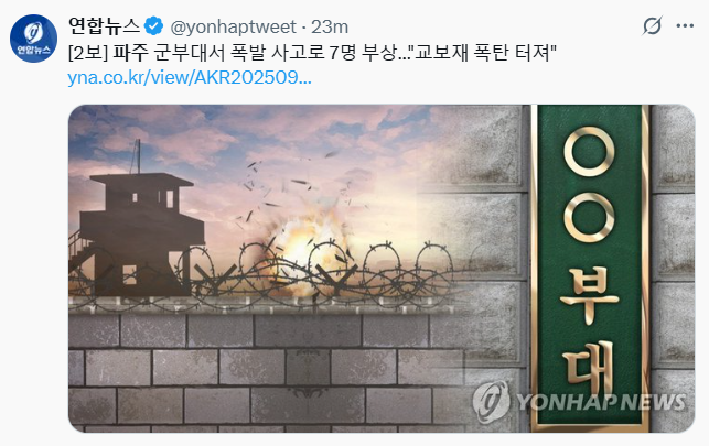 【點新聞報道】據央視新聞報道,當地時間10日15時30分左右,位於韓國京畿坡州市的陸軍部隊發生爆炸事故。韓聯社最新消息稱,至少有8名士兵受傷,其中兩人傷勢嚴重。