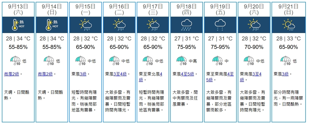 天文台續說,高空反氣旋會在未來一兩日為廣東帶來普遍晴朗及持續酷熱的天氣。受高空擾動影響,下周初廣東沿岸有驟雨及雷暴。