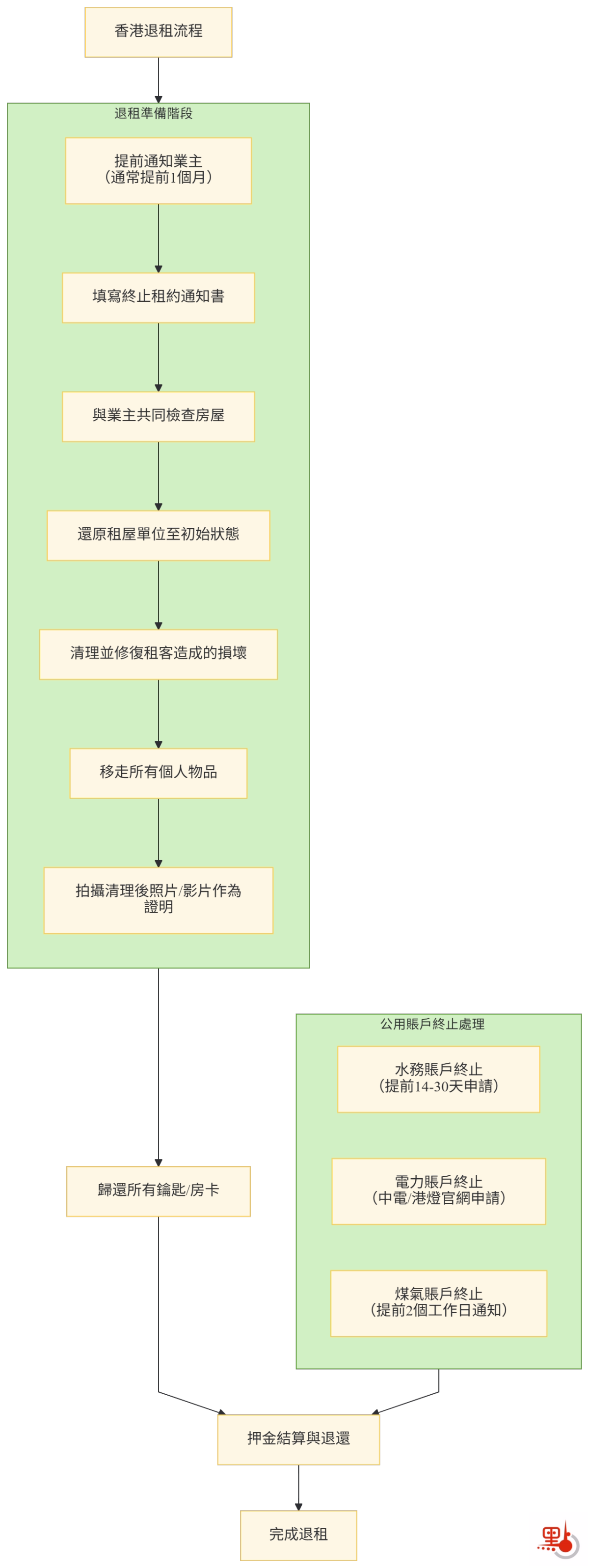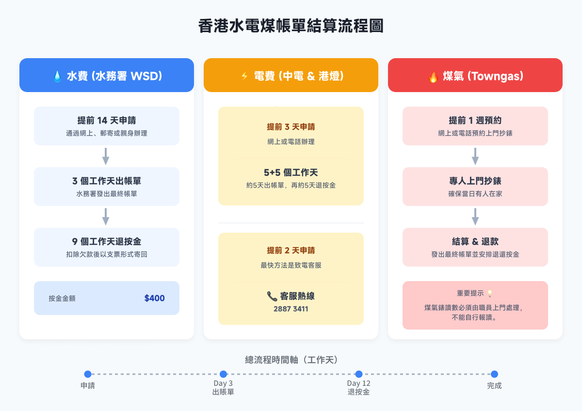 - 水電煤要早關:水務署需提前14天申請,中電3天,港燈2天,逾期可能影響按金退還