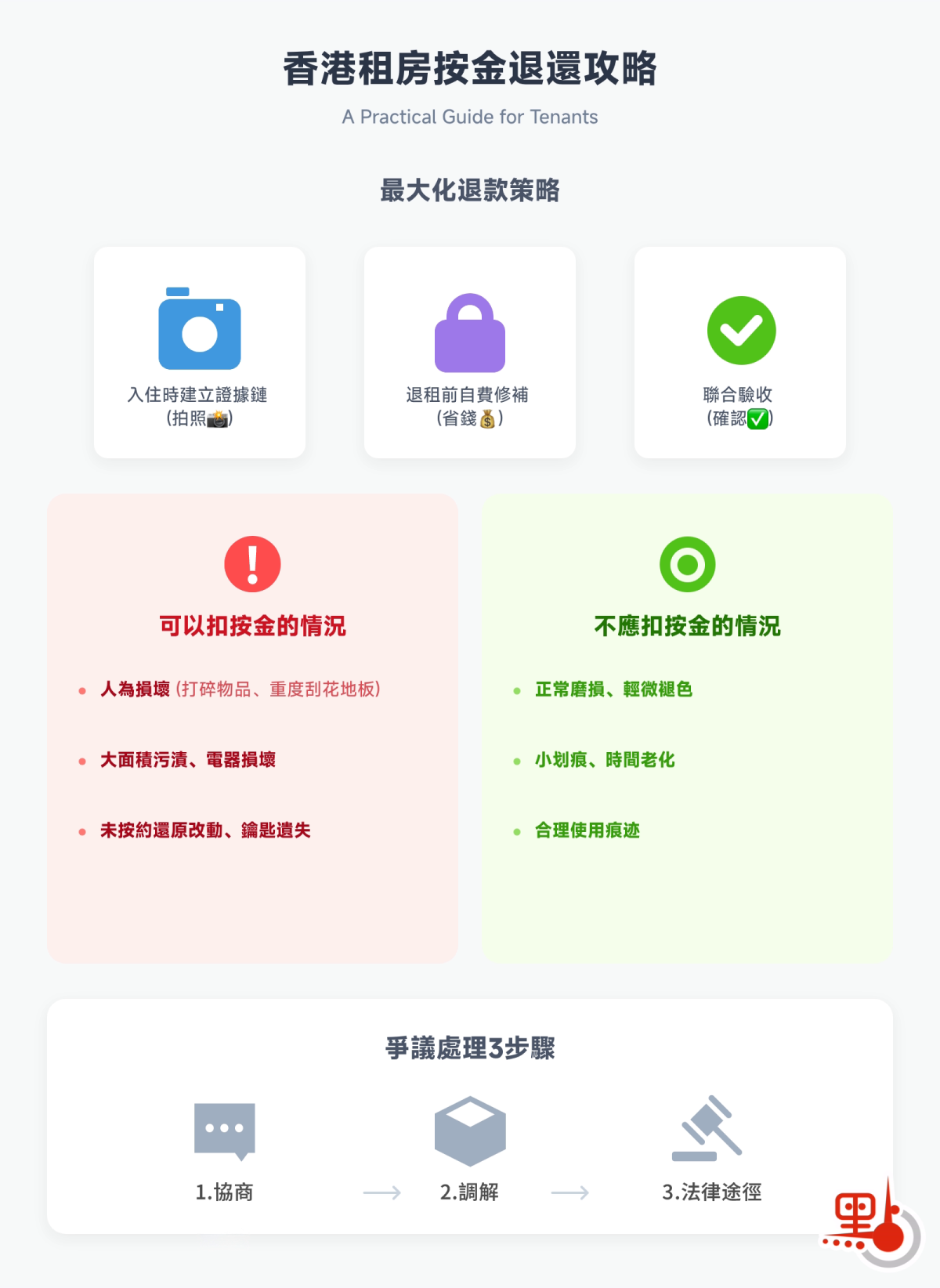 - 跟進按金:一般7-14天內退還,如有爭議先協商,必要時可向小額錢債審裁處申請。