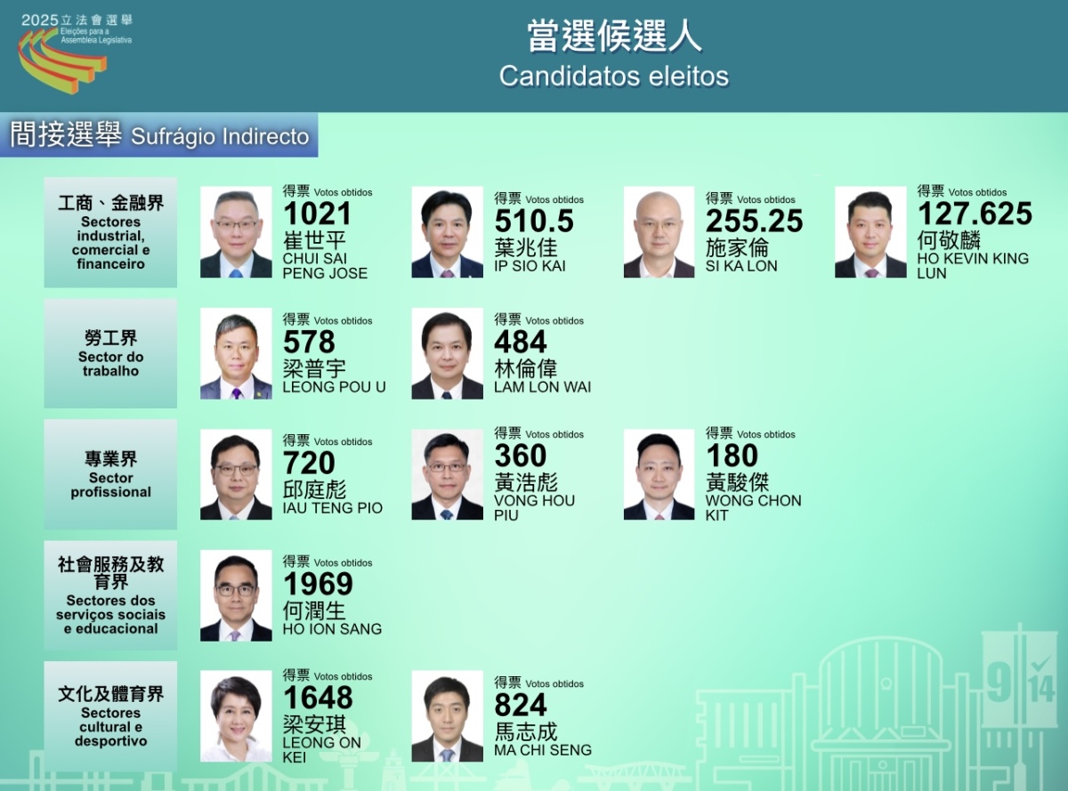 至於間接選舉點票結果,當選候選人分別為:崔世平、葉兆佳、施家倫、何敬麟(工商、金融界);梁普宇、林倫偉(勞工界);邱庭彪、黃浩彪、黃駿傑(專業界);何潤生(社會服務及教育界);梁安琪、馬志成(文化及體育界)。