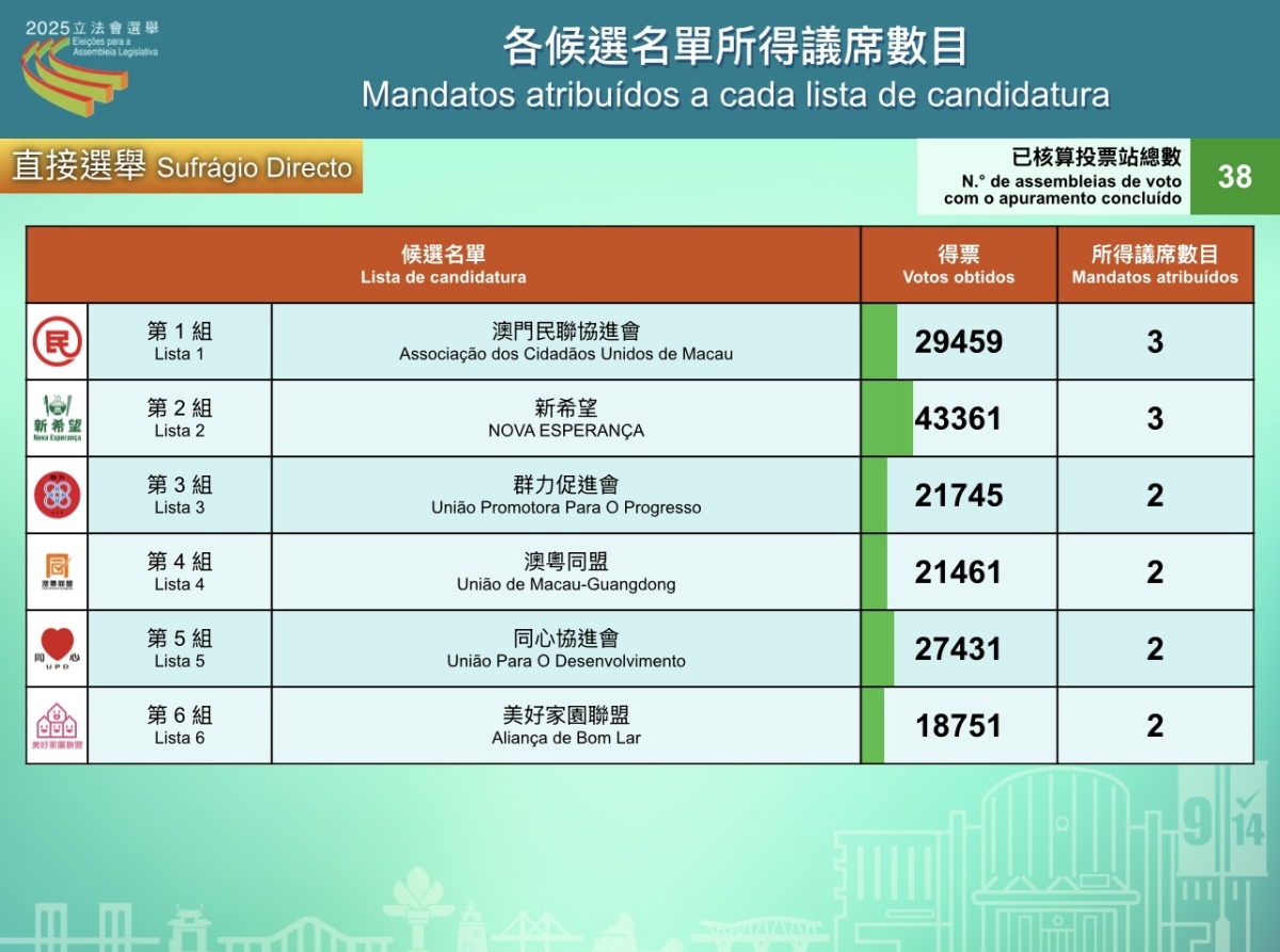直接選舉中得票最多的是第2組新希望,取得3個議席;其次是第1組的澳門民聯協進會,同樣取得3個議席。直選當選人按得票順序依次為,第2組新希望高天賜;第1組澳門民聯協進會宋碧琪;第5組同心協進會李靜儀;第3組群力促進會梁鴻細;第2組新希望陳孝永;第4組澳粵同盟柳智毅;第6組美好家園聯盟黃潔貞;第1組澳門民聯協進會李良汪;第5組同心協進會梁孫旭;第3組群力促進會顏奕恒;第2組新希望謝誓宏;第4組澳粵同盟李居仁;第6組美好家園聯盟呂綺穎;第1組澳門民聯協進會陳禮祺。