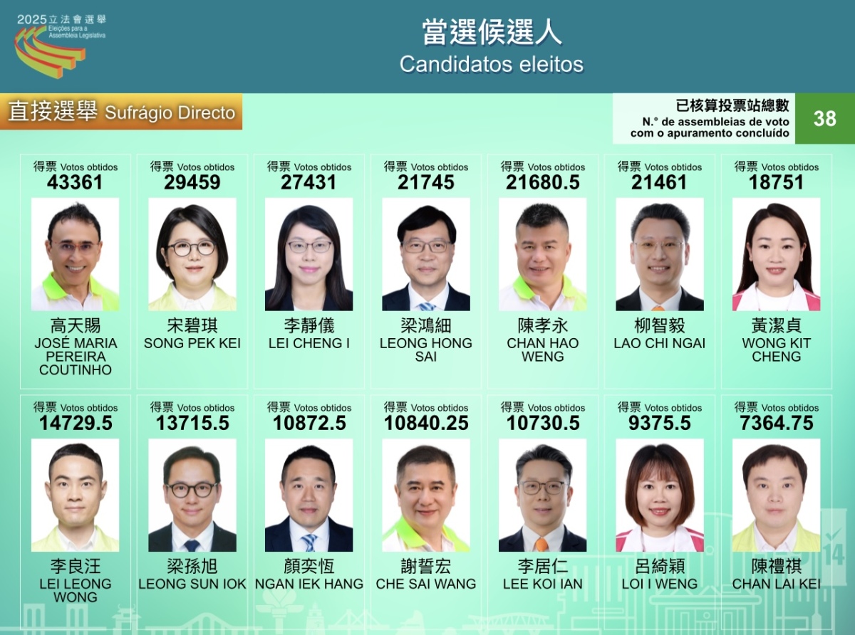澳門第八屆立法會選舉完成點票,14名直選當選人中,「票王」由第2組新希望高天賜奪得、「票后」則為第1組澳門民聯協進會宋碧琪。