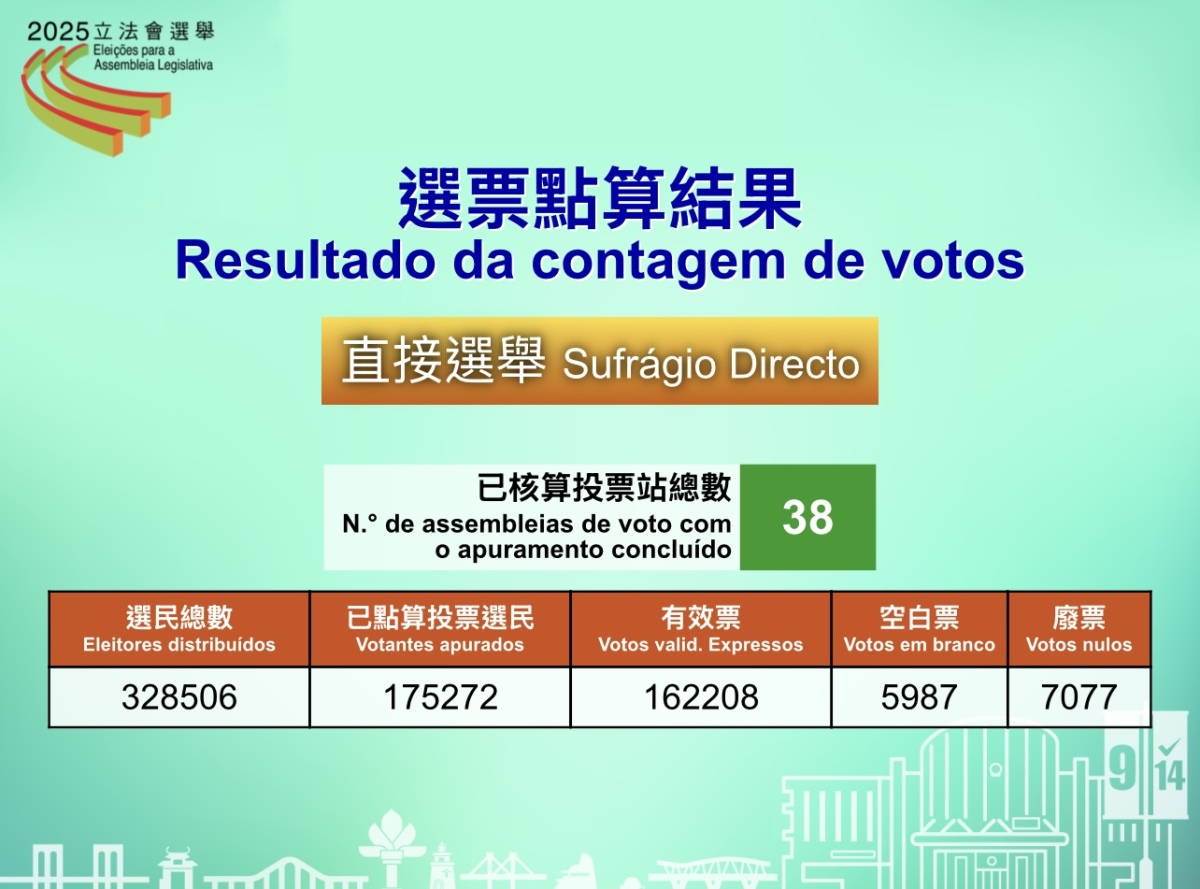 立法會選舉管理委員會今日舉行新聞發布會公布初步點票結果,表示第八屆立法會選舉的投票程序經已完結,其中,直接選舉共有175,272位選民投票,投票率53.35%,間接選舉共有6,645位選民投票,投票率88.12%。