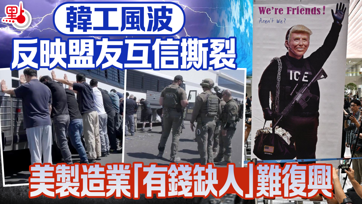 偏偏在這場「戰鬥」中,韓國卻在7月30日美韓首腦會談上,同意以3,500億美元(約2.7萬億港元)投資換取降低關稅,表面是成果,但實際上關鍵的技術簽證制度長期缺位。韓企只能依賴B-1出差簽證勉強維繫,最終換來的卻是300多名工人被鐵鏈捆綁的屈辱場景。
