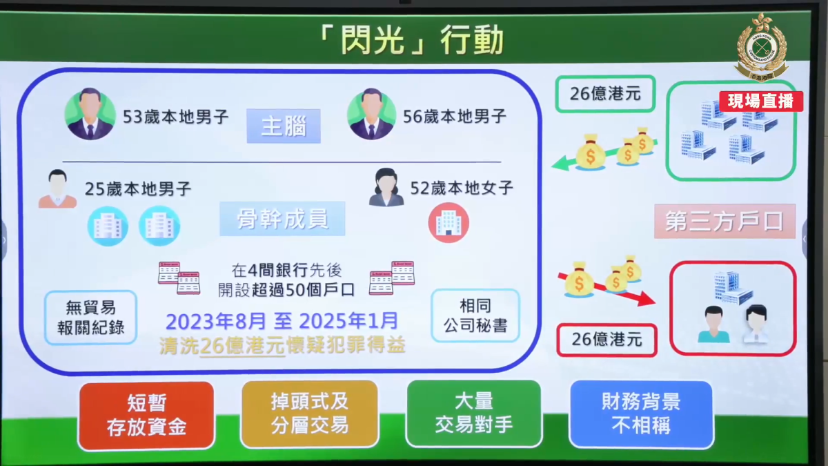 海關今日(16日)簡報案情指,海關年初接獲情報鎖定一個清洗黑錢集團並展開財富調查,發現集團利用3間空殼公司,報稱進行電子器材貿易及市場營銷等業務,實際先後在4間銀行開設超過50個銀行戶口,由2023年8月至今年1月,即1年半的時間內進行頻繁的大額交易,牽涉共1800個交易對手,進行超過6000宗交易,收取合共26億元犯罪得益。最大一宗交易發生在2024年,涉款2600萬元。