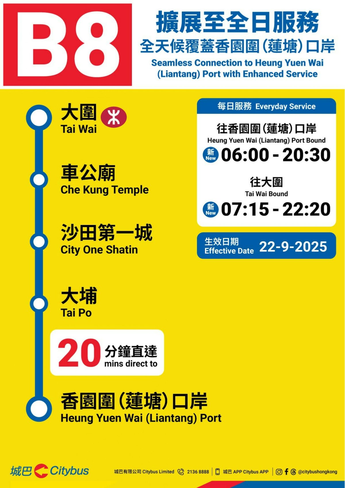 【點新聞報道】為配合乘客對香園圍口岸(蓮塘口岸)服務需求日益增長,城巴今日(16日)公布,9月22日起提升「新界東口岸特快」B8路線服務,北上班次延長至晚上8時半,南下班次最早為7時15分,實現全天候覆蓋香園圍口岸的開放時間。