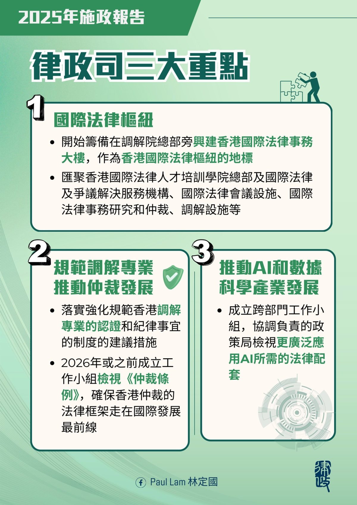 【點新聞報道】行政長官李家超今日(17日)發表新一份施政報告,主題是「深化改革 心繫民生 發揮優勢 同創未來」。律政司司長林定國在社交平台表示,報告展現香港主動對接國家發展戰略、實現突破新局面的策略部署。他總結律政司部分涵蓋了三大政策重點,分別是國際法律樞紐、調解文化及仲裁發展,以及推動AI和數據科學產業發展。