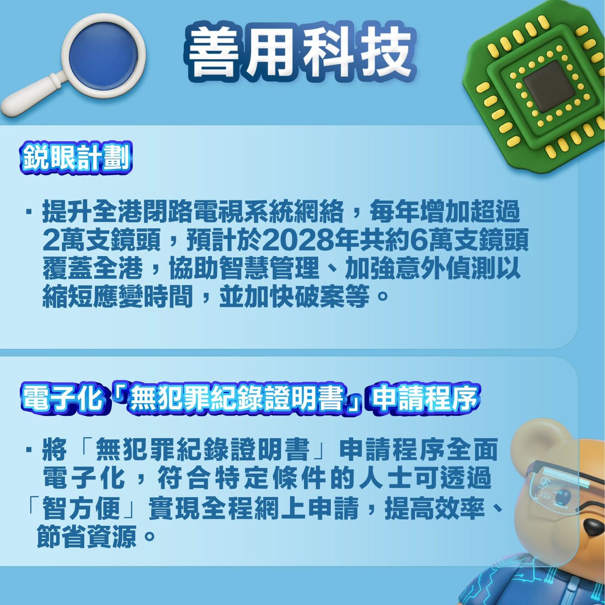 其中,銳眼計劃值得關注。保安局指出,將提升全港閉路電視系統網絡,每年增加超過兩萬支鏡頭,預計到2028年,有共約6萬支鏡頭覆蓋全港,協助智慧管理、加強意外偵測以縮短應變時間,並加快破案等。