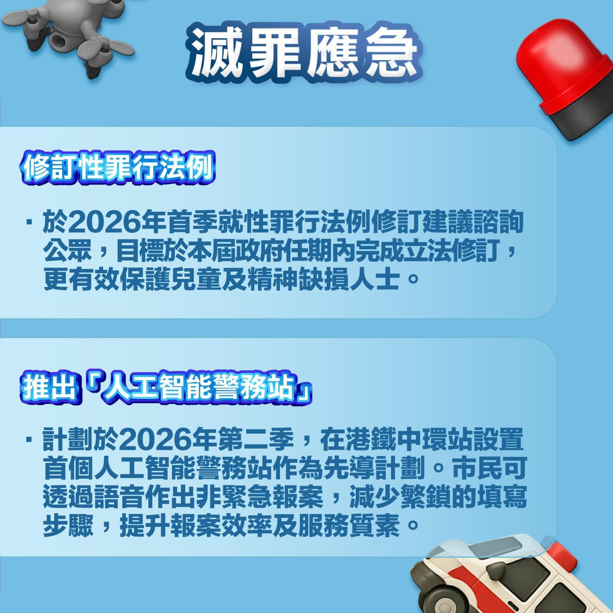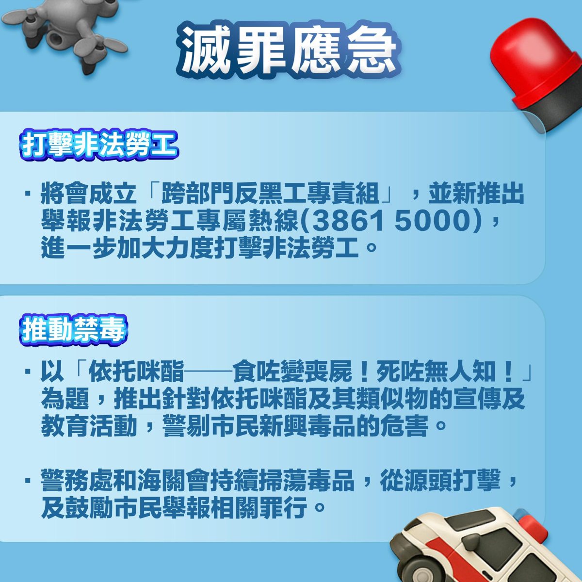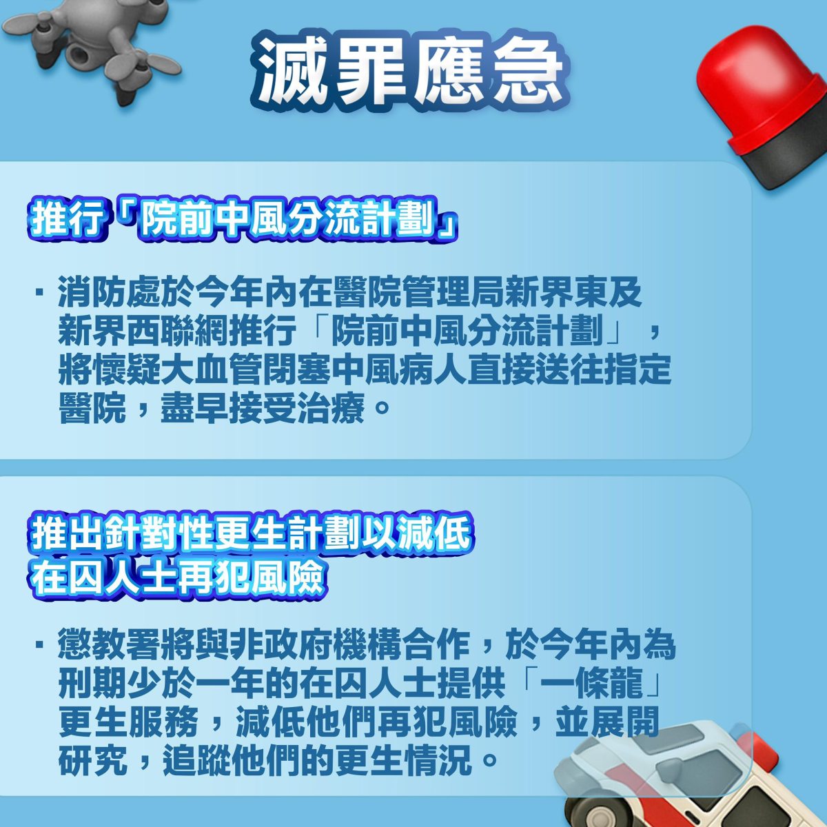 【點新聞報道】行政長官李家超今日(17日)發表新一份施政報告。保安局亦在社媒發布了5大核心施政範疇,旨在建構一個更安全、更便利、更宜居的城市。5項重點包括: