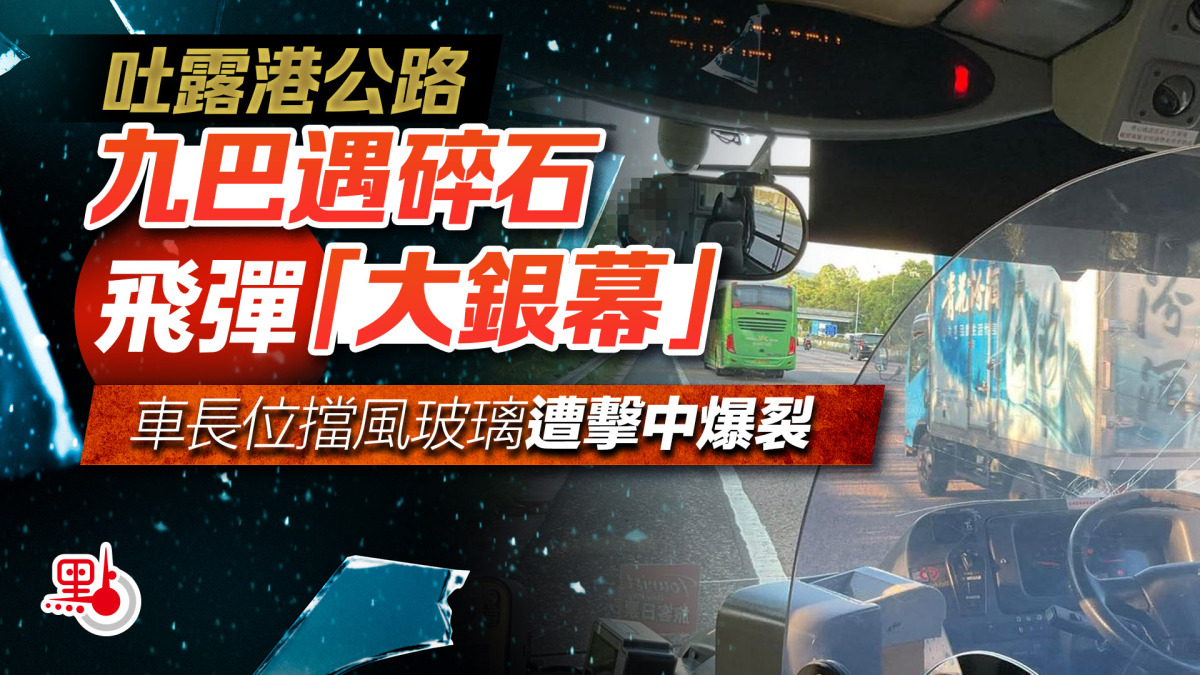 【點新聞報道】繼周一(15日)青朗公路發生「鐵通插城巴」罕見意外,今日(18日)再有巴士被雜物擊中。今早7時許,一輛九巴沿吐露港公路、駛至近科學園時,被路面彈起的碎石擊中。網上圖片可見,巴士「大銀幕」近車長位前面部分的擋風玻璃爆裂。