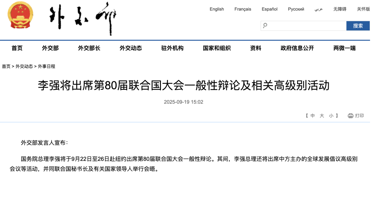 【點新聞報道】據外交部網站9月19日消息,外交部發言人宣布,國務院總理李強將於9月22日至26日赴紐約出席第80屆聯合國大會一般性辯論。其間,李強總理還將出席中方主辦的全球發展倡議高級別會議等活動,並同聯合國秘書長及有關國家領導人舉行會晤。