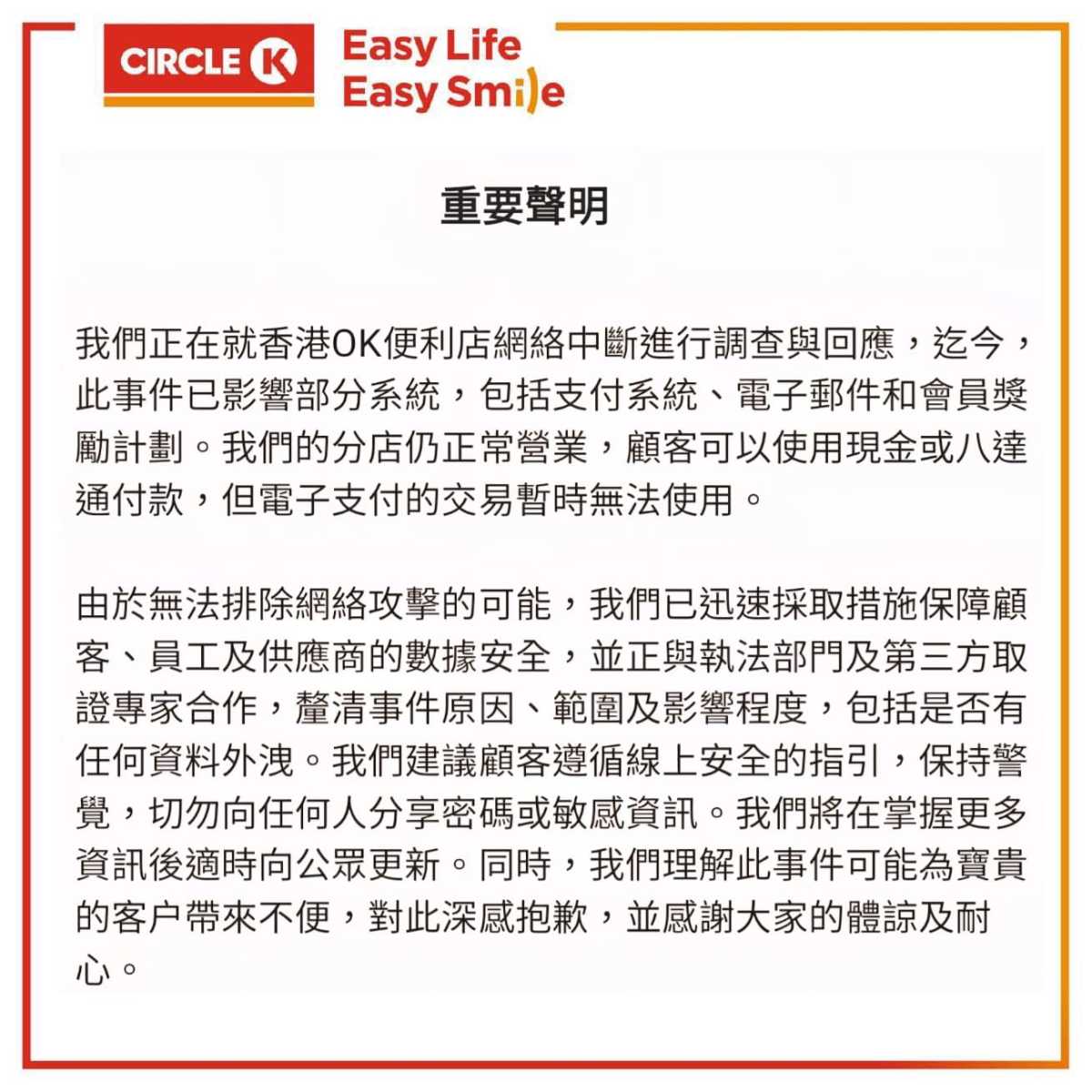 OK便利店今日(21日)就事件發聲明指,由於無法排除網絡攻擊的可能,OK便利店採取措施保障顧客、員工及供應商的數據安全,並正與執法部門及第三方取證專家合作,釐清事件原因、範圍及影響程度,包括是否有任何資料外洩。