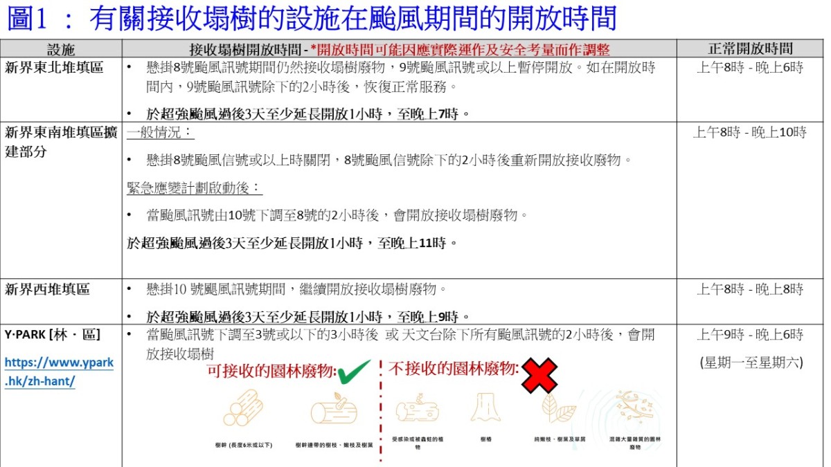 為協助政府及業界於颱風後迅速處理塌樹及廢物以盡快復常,環境保護署已於過往多天與廢物運輸業界保持緊密溝通,並採取多項措施以盡力減輕風暴可能帶來的影響,包括:預留充足的臨時木料廢物收集區,以接收及暫存因颱風襲港所收集的塌樹廢物,及預早準備應急的鋸木及碎木機,以協助盡快清理塌樹廢物;安排在超強颱風過後的3天,延長各市區廢物轉運站、新界西、新界東南及新界東北堆填區的開放時間至少1小時。