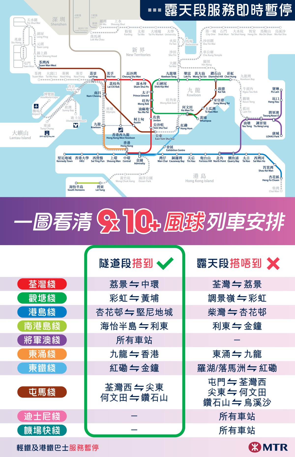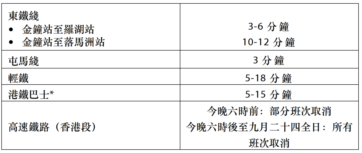 港鐵指出,隨着風暴接近本港及因應乘客量,服務班次會逐步減少。而在八號烈風或暴風信號發出3小時後,港鐵巴士將會暫停服務。若天氣情況突然轉差,港鐵露天段列車、輕鐵及港鐵巴士可能在未有預先通知的情況下暫停。