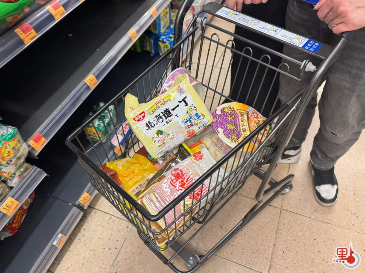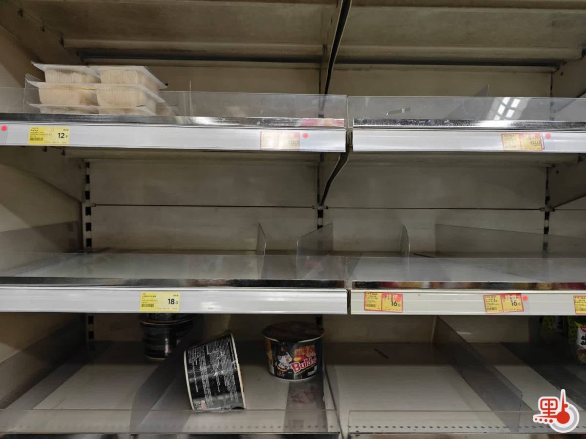 昨晚,點新聞記者探訪深水埗一間惠康,純淨水已售罄,貨櫃上僅剩氣泡水,即食麵貨櫃上亦只剩兩桶火雞麵。