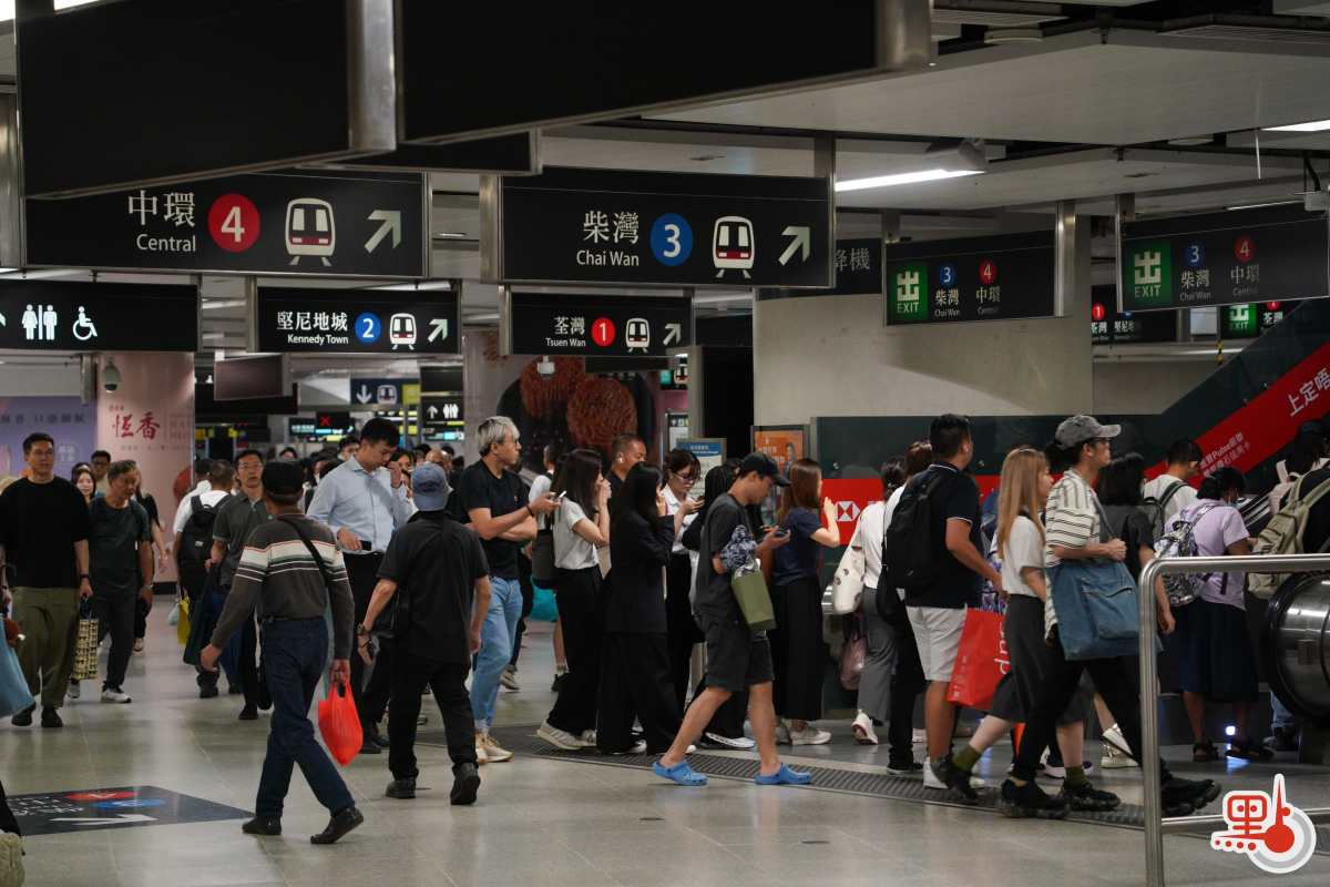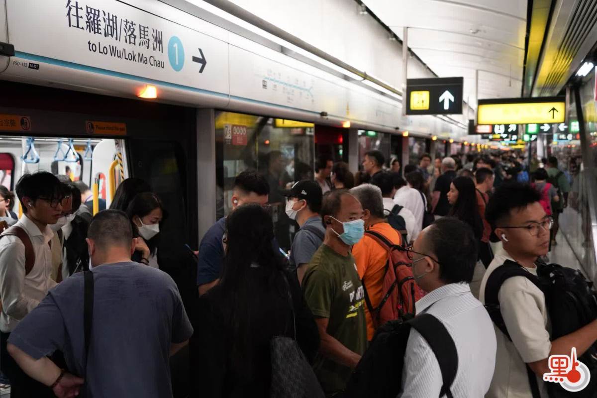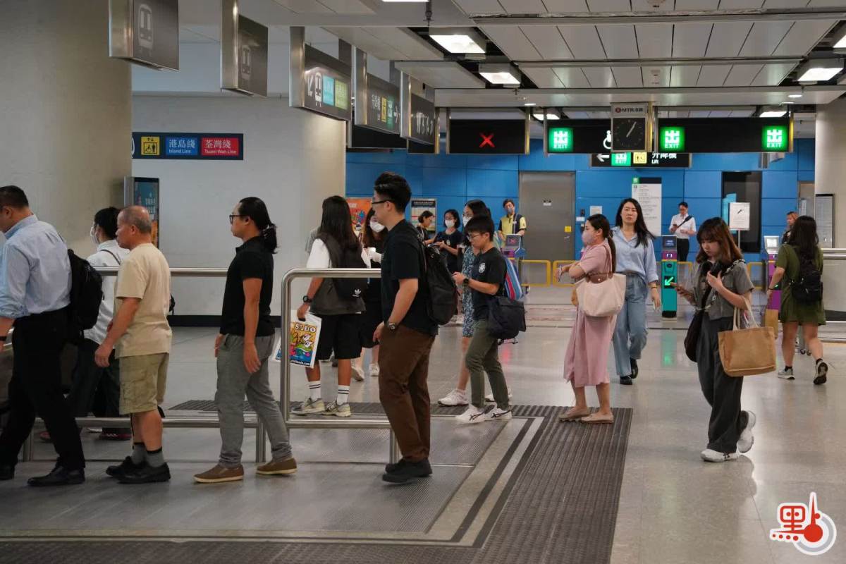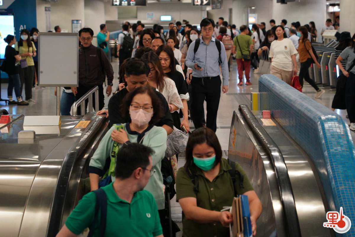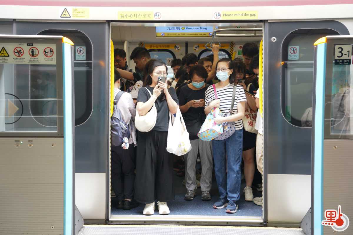 點新聞記者於港鐵金鐘站、九龍塘站與紅磡站內見到,許多打工人趕在八號風球懸掛之前趕回家,港鐵站內人流眾多,扶梯與月台大排長龍。