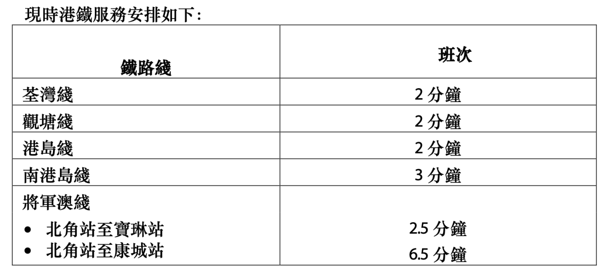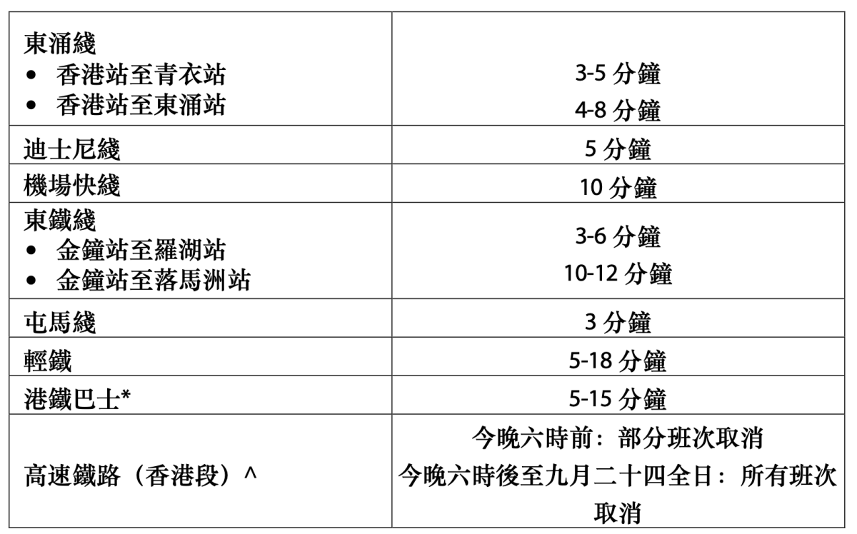 在八號烈風或暴風信號下,港鐵列車仍會繼續服務。然而,若天氣情況突然轉差,港鐵露天段列車、輕鐵及港鐵巴士可能在未有預先通知的情況下暫停。港鐵表示,現時已加強各主要車站的人手協助乘客。期間,個別車站可能會實施客流管理措施,確保客流暢順。