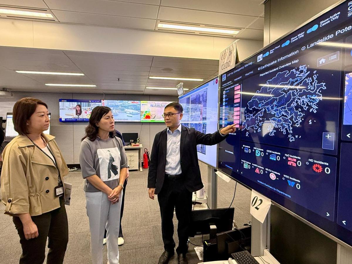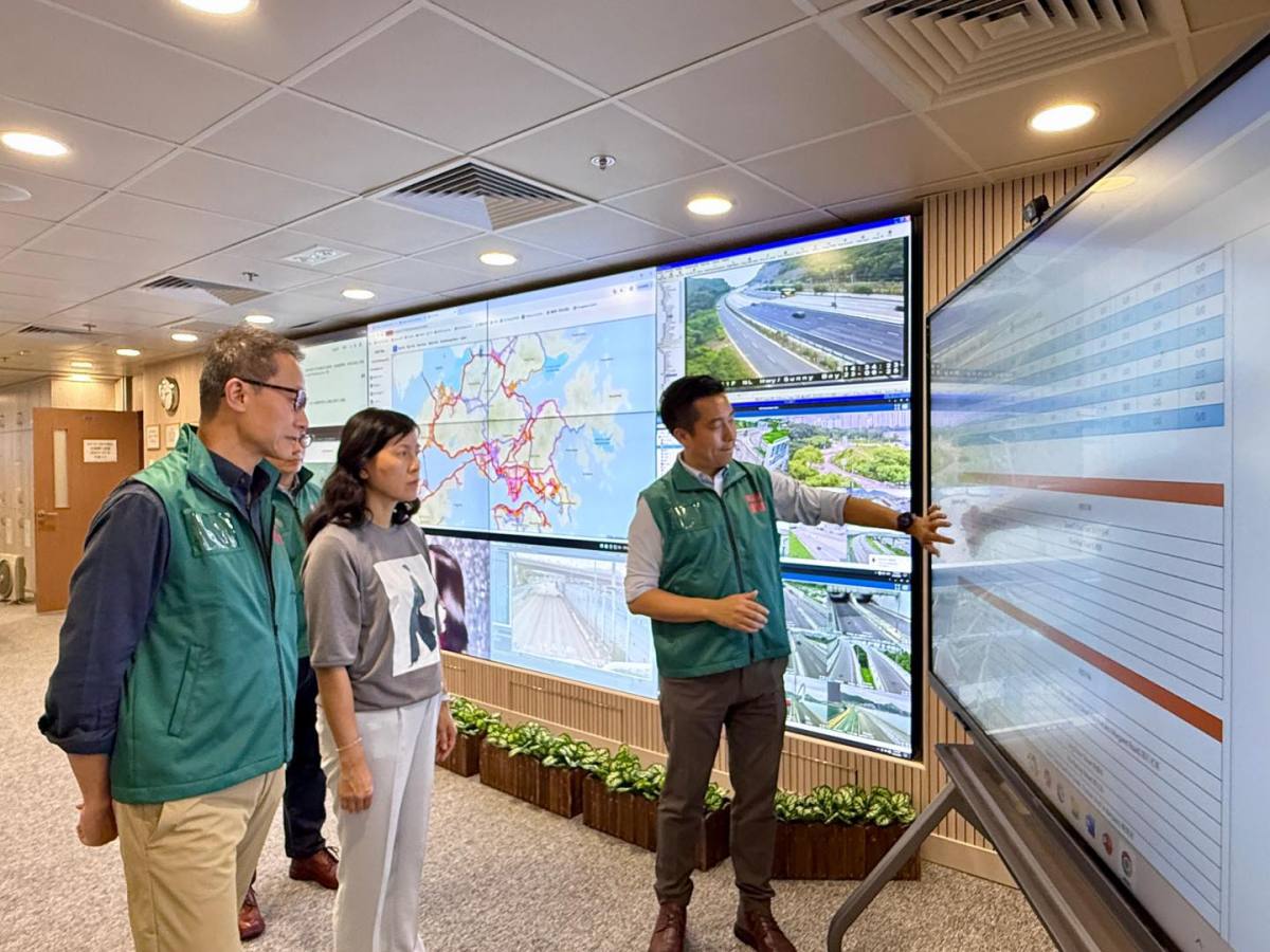 陳美寶其後又到路政署轄下的緊急控制中心,了解8號熱帶氣旋警告信號發出後的各區路面情況。緊急控制中心已於昨日上午10時半率先啟動,路政署的同事聯同道路維修保養承建商實時監察主要公共道路的最新情況,以便隨時應對惡劣天氣可能引發的公共道路突發情況,路政署轄下近200隊應急隊伍已隨時候命,將按需要在安全情況下出動巡查主要道路,清理道路上的塌樹、障礙物及淤塞的道路集水溝和渠道,以及為倒塌的斜坡進行緊急圍封及搶修工程等。