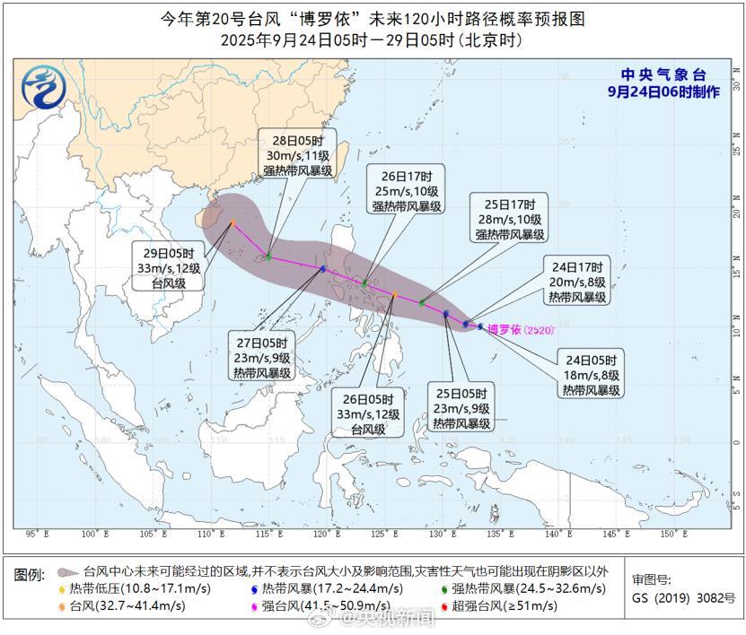 【點新聞報道】打風「浪接浪」!據中央氣象台最新消息,今年第20號颱風「博羅依」今(24日)早5時在菲律賓以東洋面生成,預計向偏西方向移動,逐漸向菲律賓東部沿海靠近,並於27日進入南海東部海域。這是今年9月南海和西太生成的第6個颱風。