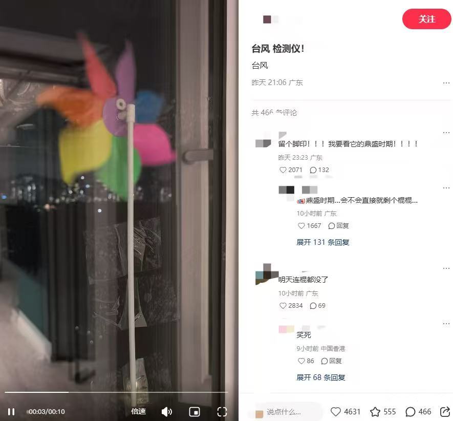 最讓人啼笑皆非的是,有人自製了「颱風檢測儀」!把各種物品綁在室外,實時觀測颱風威力。