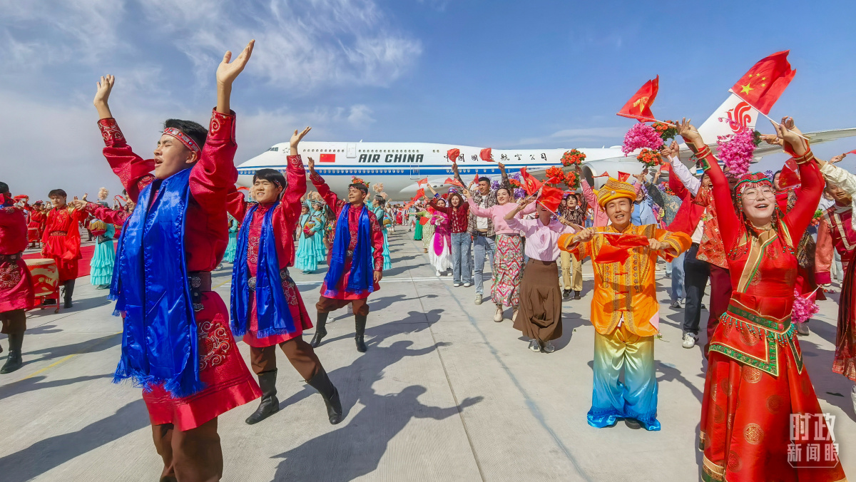 在機場,各族群眾代表身着民族服飾,載歌載舞。從機場到住地,各族群眾手持紅旗,熱情歡呼,表達對總書記的歡迎和感激之情。