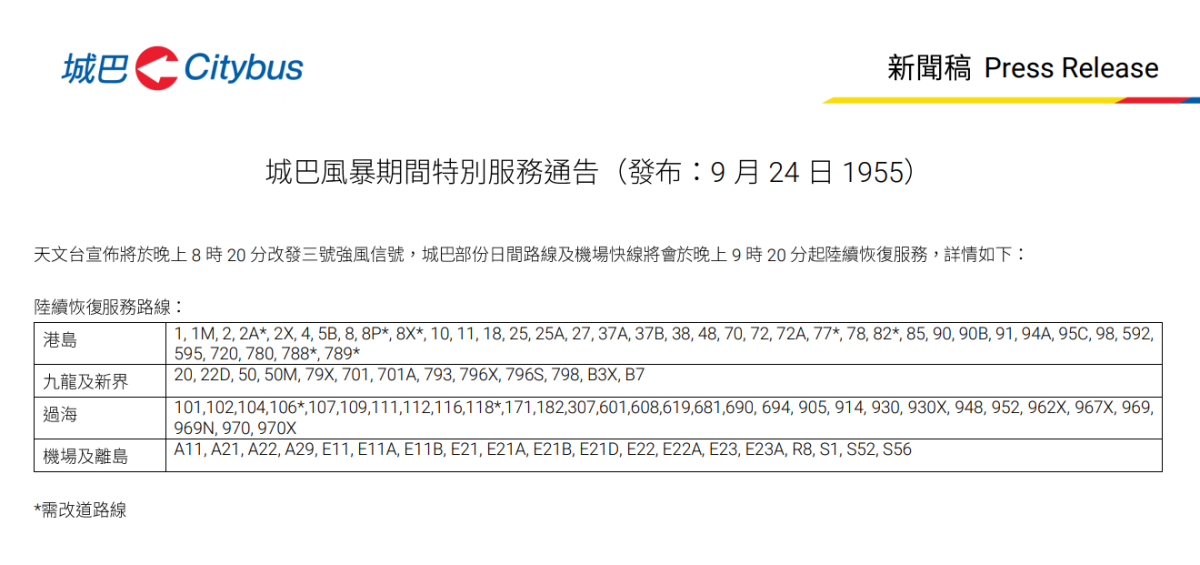 九巴及龍運指,受多區塌樹及水浸影響,部分路線將改道行駛、縮短路線或需時更長時間才能恢復服務。九巴及龍運的外勤人員正加緊巡邏路面情況,及與政府部門保持緊密聯繫。