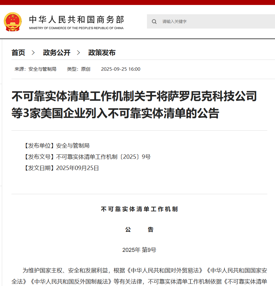 根據商務部官方網站公告,為維護國家主權、安全和發展利益,根據《中華人民共和國對外貿易法》《中華人民共和國國家安全法》《中華人民共和國反外國制裁法》等有關法律,不可靠實體清單工作機制依據《不可靠實體清單規定》第二條、第八條和第十條等有關規定,決定將薩羅尼克科技公司(Saronic Technologies, Inc.)、愛爾康公司(Aerkomm Inc.)、國際海洋工程公司(Oceaneering International, Inc.)等3家實體列入不可靠實體清單,並採取以下處理措施: