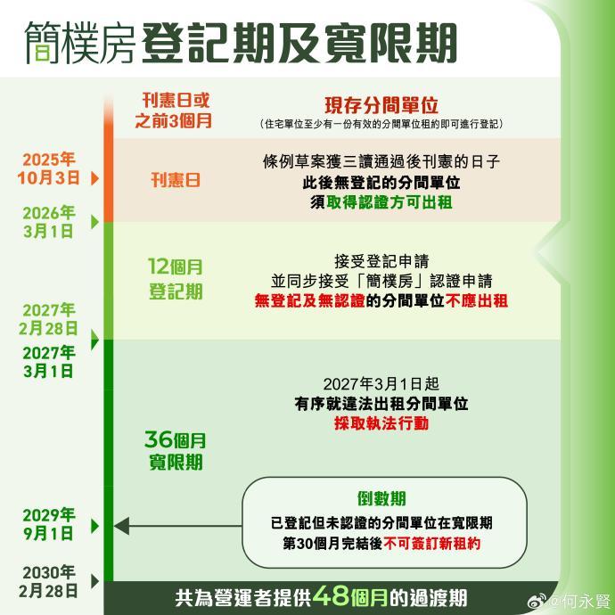 根據《條例草案》,登記制度為期12個月,由2026年3月1日至2027年2月28日為止,期間登記申請費用全數豁免。完成登記後,可獲36個月的寬限期,讓已登記單位業主或營運者展開改造工程和申請認證。登記期和寬限期合共48個月,體現《條例草案》作為全面落實新規管制度的過渡安排。