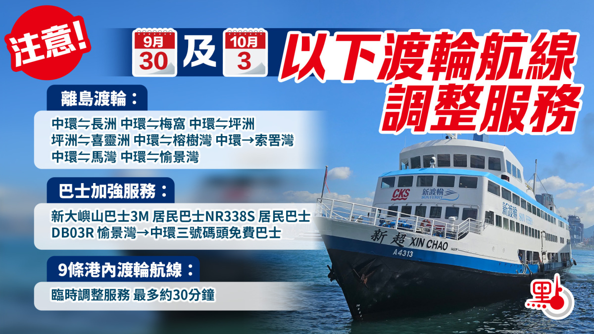 乘客需注意,9月30日上午約8時30分至9時30分,以及10月3日上午約10時45分至11時45分期間,灣仔⇋尖沙咀、中環⇋尖沙咀、北角⇋紅磡、北角⇋九龍城、中環⇋紅磡、北角⇋觀塘、水上的士、西灣河⇋觀塘,以及西灣河⇋三家村共9條港內渡輪航線,或會因應實際情況而需臨時調整服務,最多約30分鐘。