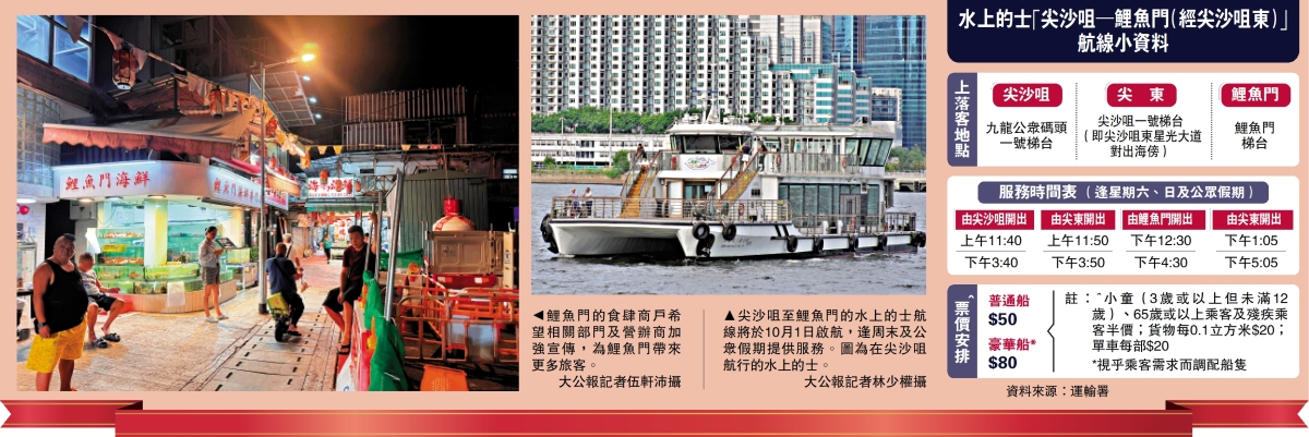 「我十分期待體驗(鯉魚門)當地漁民文化、海鮮大牌檔。」計劃趁國慶黃金周來港旅遊的山東旅客張小姐昨日向大公報記者表示,曾聽過香港的鯉魚門,但不了解景點內容和地方特色,若有水上的士這類新型的交通方式,方便旅客直達鯉魚門,沿途觀賞維港景色,相信會是不錯的打卡路線,她期望,「船上最好有導遊講解,介紹鯉魚門歷史文化,更能加深旅客印象。」