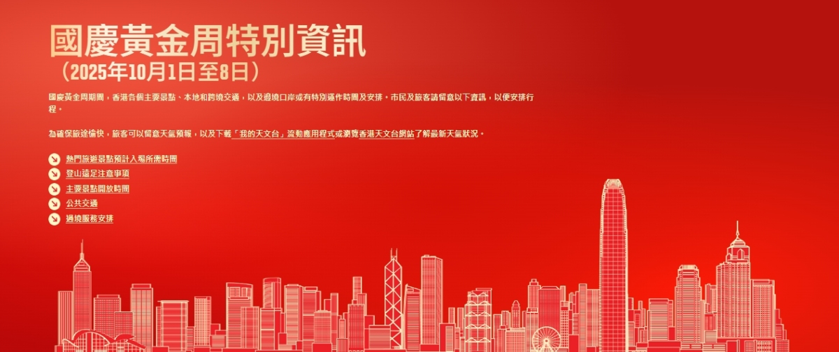 在內地國慶黃金周假期期間,旅發局亦會於專頁內提供本港的熱門旅遊景點的輪候時間,包括香港迪士尼樂園、香港海洋公園、山頂纜車、昂坪360纜車、香港摩天輪,以及不少旅客選擇乘搭的天星小輪,讓市民及旅客更便捷地計劃行程。
