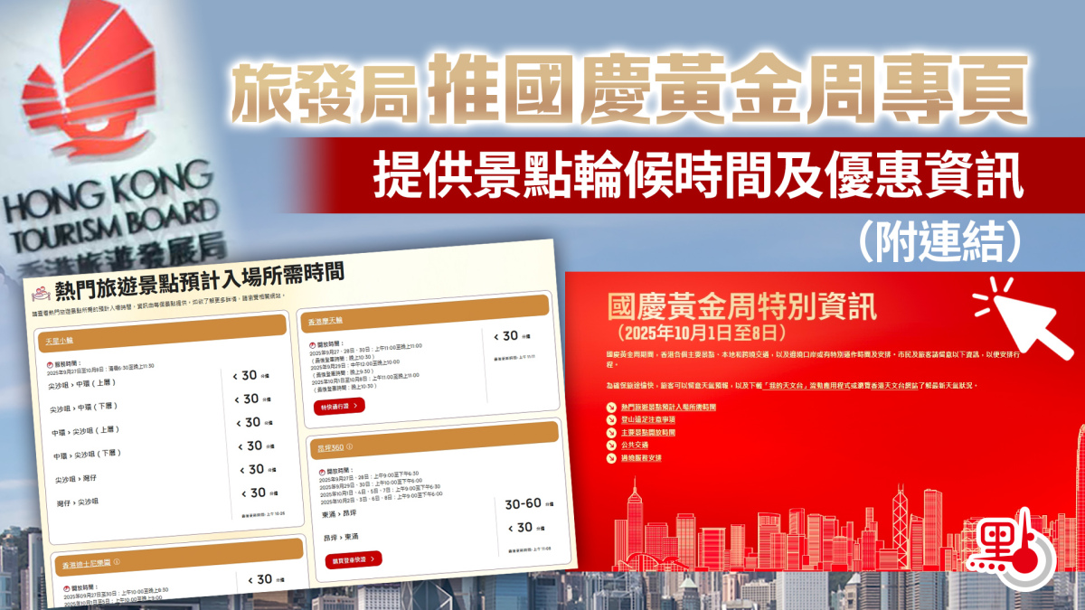 【點新聞報道】香港旅遊發展局(旅發局)日前推出專頁(點擊瀏覽),匯集內地國慶黃金周期間本港主要旅遊景點營運安排、各項特別推廣活動等。