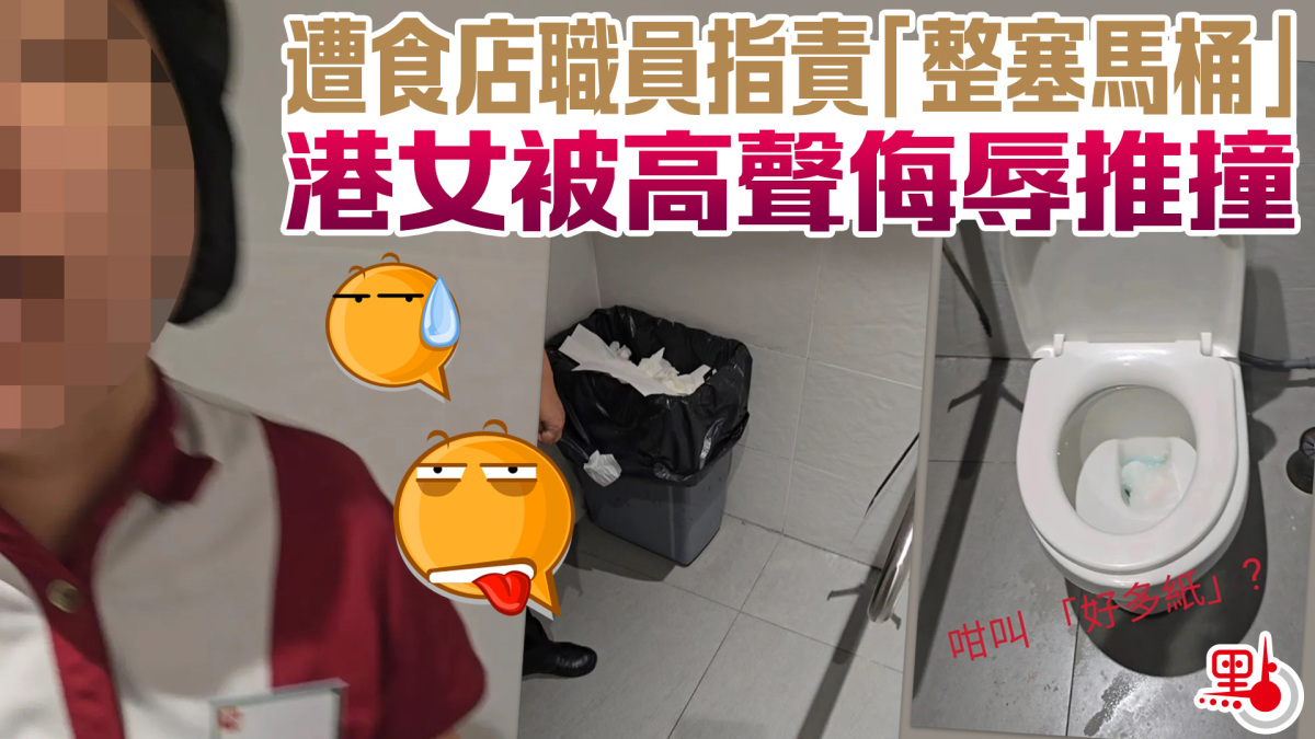 【點新聞報道】今時今日仲咁嘅服務態度!有港女在社交平台發文大呻,日前在灣仔連鎖食店因使用洗手間而和店員發生爭執,被指責「整塞馬桶」,更遭惡言侮辱及推撞,直斥對方是「餐飲業嘅害群之馬」。