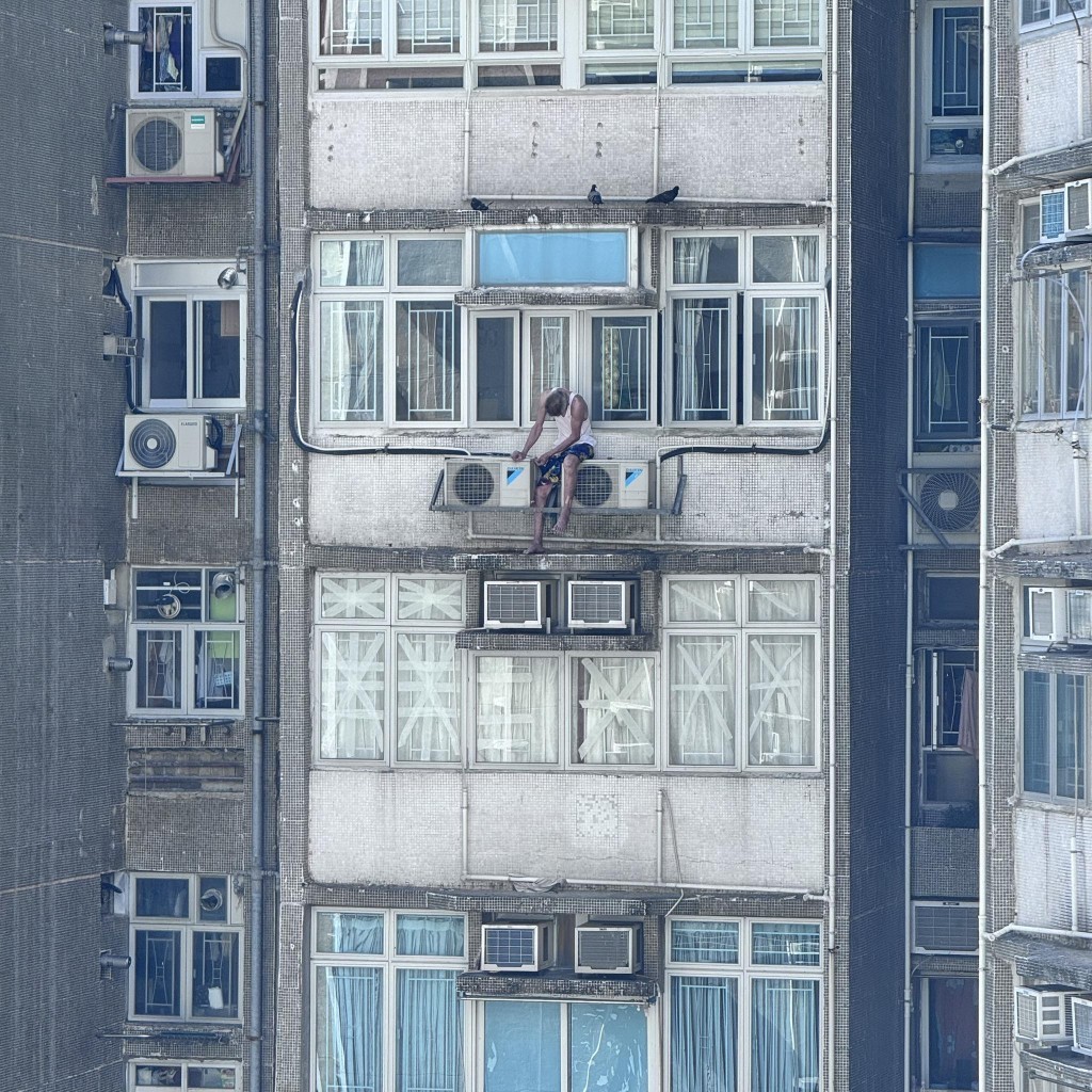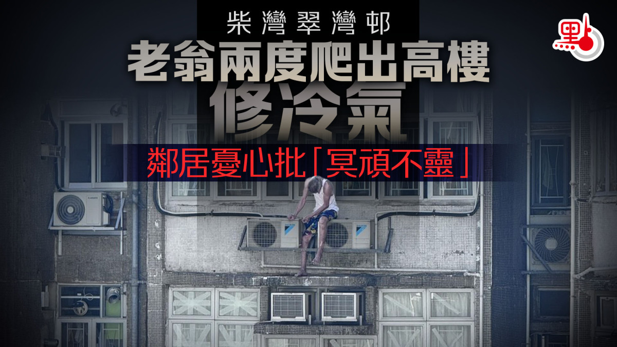 有網民在社交平台發布一張照片,圖中可見一名身穿白色背心的老翁在柴灣翠灣邨住所,整個人爬出窗外進行冷氣維修。當時他坐在冷氣機上,雙腳踩着下一層的簷篷,身上未佩戴任何安全裝備,情況相當危險。
