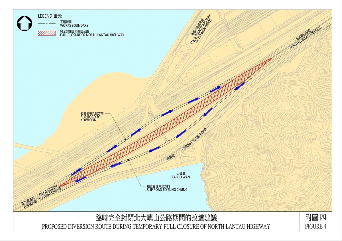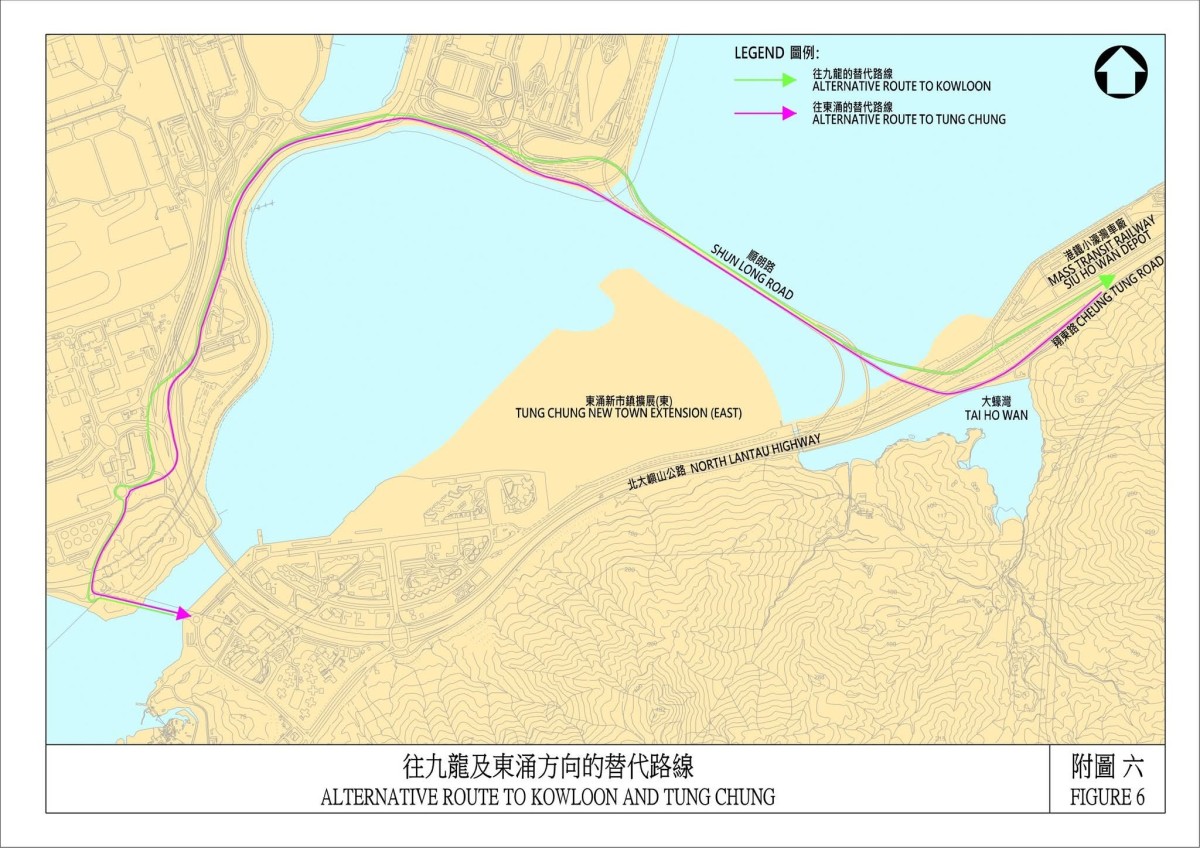 運輸署指,沿北大嶼山公路西行的駕駛人士,須臨時改經北大嶼山公路近港鐵小蠔灣車廠的一段支路西行,然後恢復行駛北大嶼山公路西行,繼續前往東涌及機場一帶。沿北大嶼山公路東行的駕駛人士,須臨時改經北大嶼山公路近港鐵小蠔灣車廠的一段支路東行,然後恢復行駛北大嶼山公路東行,繼續前往青衣及九龍。