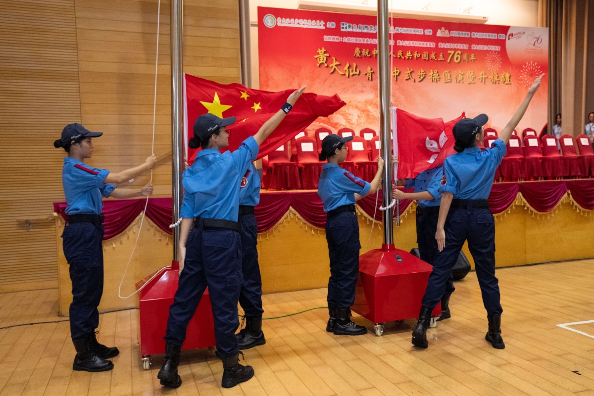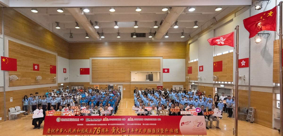 【點新聞報道】黃大仙區於9月28日舉辦多場賀國慶迎全運活動,包括由黃大仙區步操推廣委員會主辦,黃大仙民政事務處及東九龍青年社合辦「中式步操匯演及升旗禮」,升旗禮匯聚區內6個青年制服團體,及9間中小學合共超過120名青年參與。他們身着整齊制服,展現紀律與團結的力量,弘揚中華民族精神,激發青少年對國家的熱愛與認同感。黃大仙民政事務專員胡鉅華致辭時表示國家76年來高速發展,作為中華兒女應深感自豪。他同時高度肯定黃大仙區步操推廣委員會多年的努力,讚揚其在推廣中式步操文化及凝聚青年力量方面的貢獻。