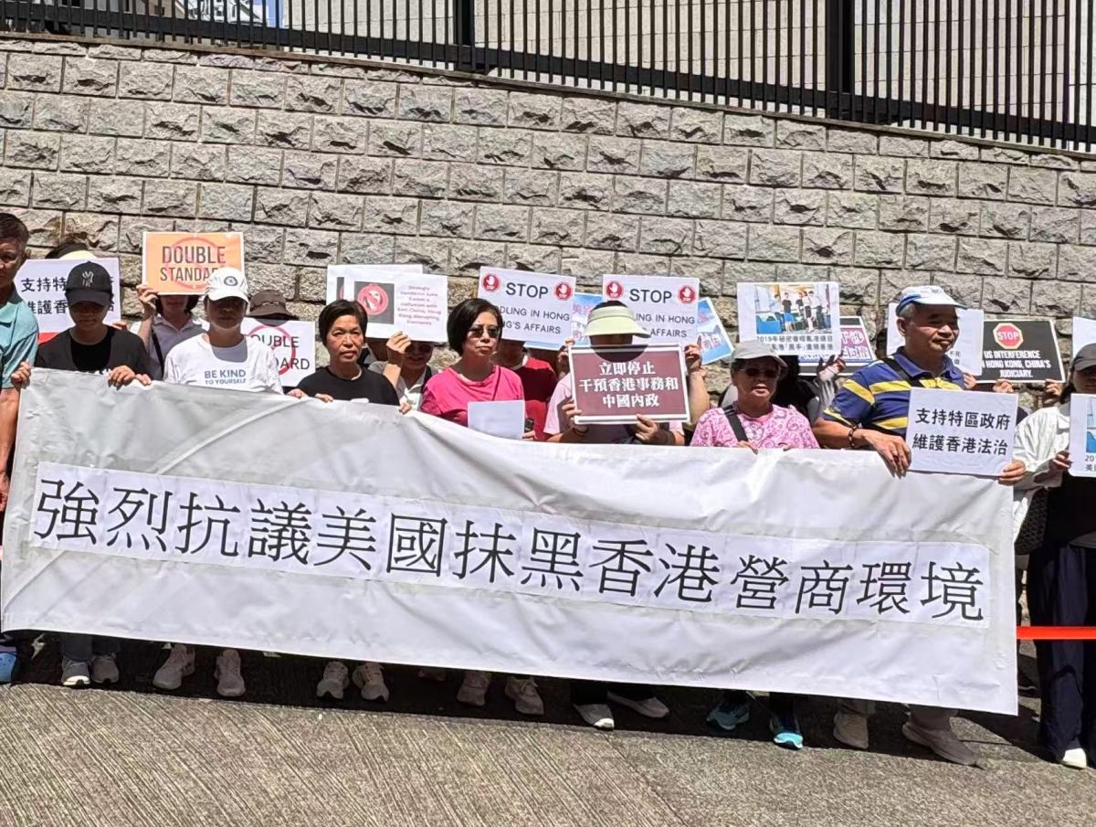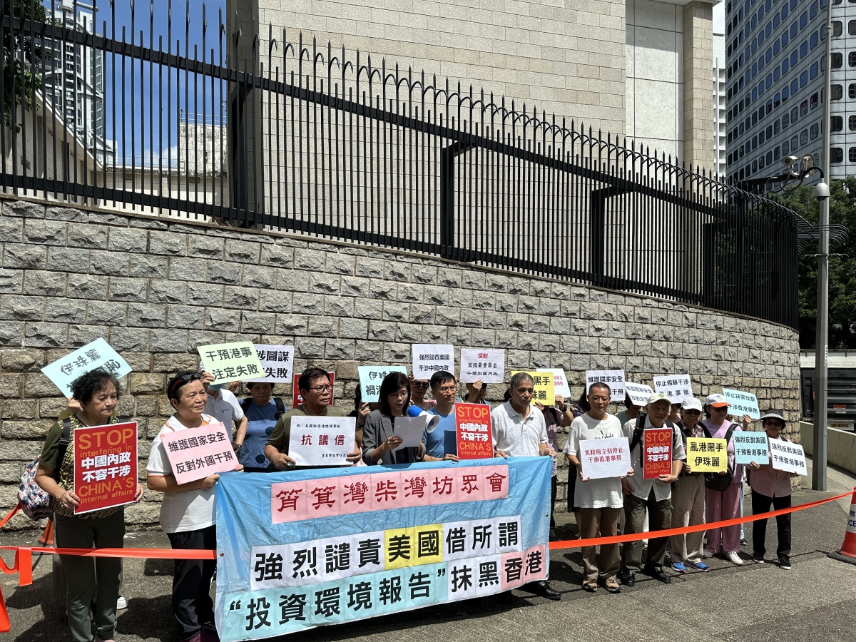 抗議團體向美領館遞交抗議信,又展開寫有「強烈譴責美國藉所謂『投資環境報告』抹黑香港」的橫幅,並手舉「干預港事 注定失敗」、「中國內政 不容干涉」等標語板。