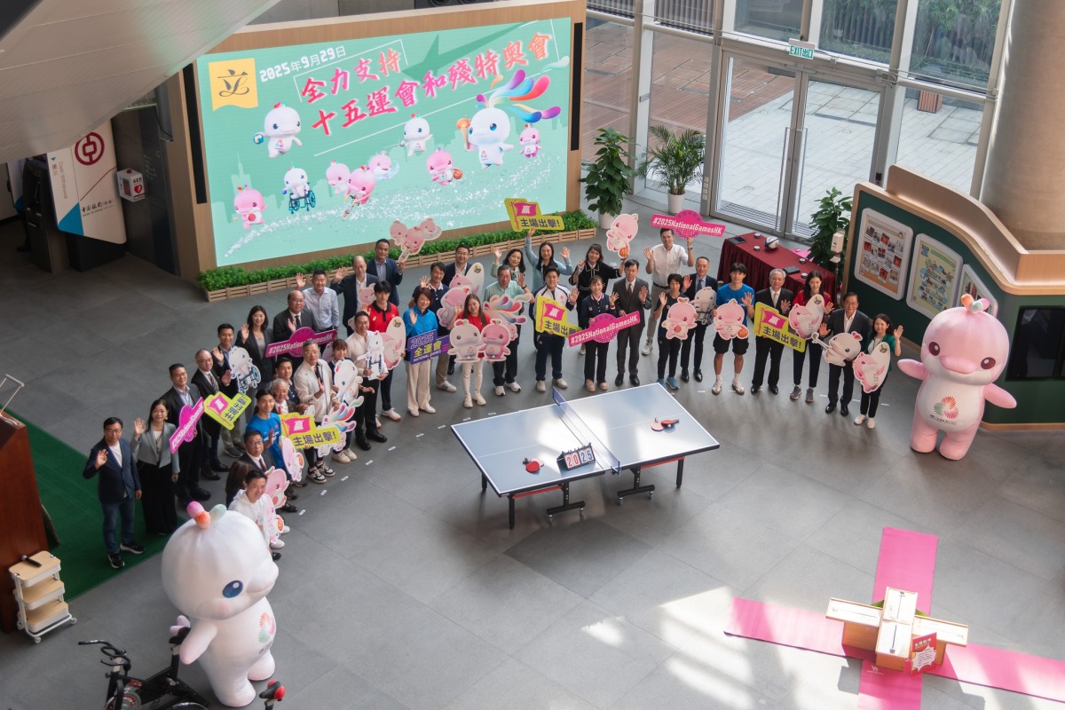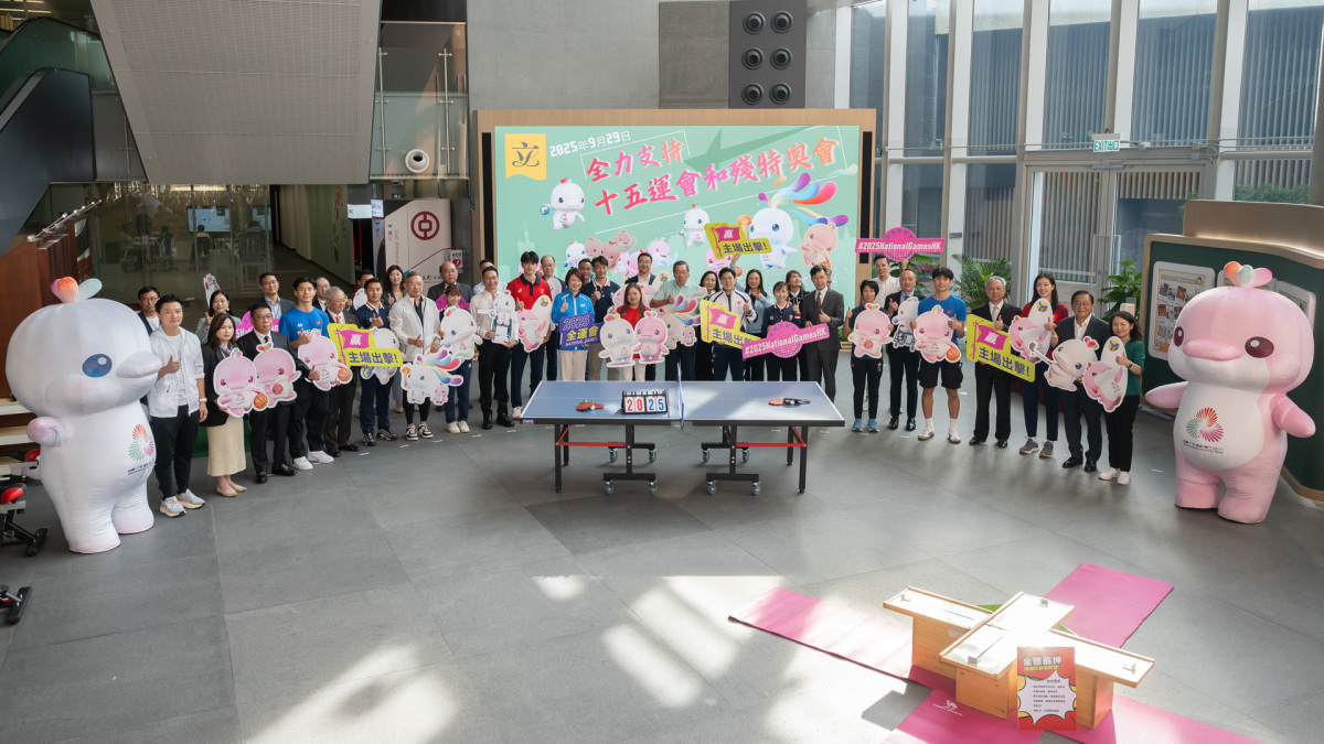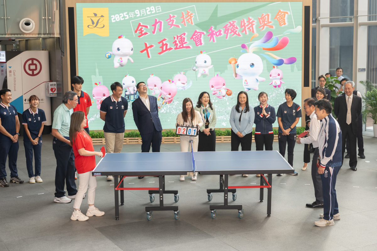 【點新聞報道】十五運會及殘特奧會將於11月9日、12月8日接連開幕,立法會本星期將舉辦一連兩場活動,全力推動全城全運熱潮。今日(29日)立法會率先舉辦「打氣活動」打響頭炮,活動中特別放置乒乓球枱,及虛擬擊劍和場地單車體驗區,讓大家體驗運動項目的時候,還可以一展身手。立法會主席梁君彥、文化體育及旅遊局局長羅淑佩、港協暨奧委會副會長霍啟剛,以及多名議員及運動員出席本次活動。現場,梁君彥、羅淑佩等還與議員即場打乒乓球。