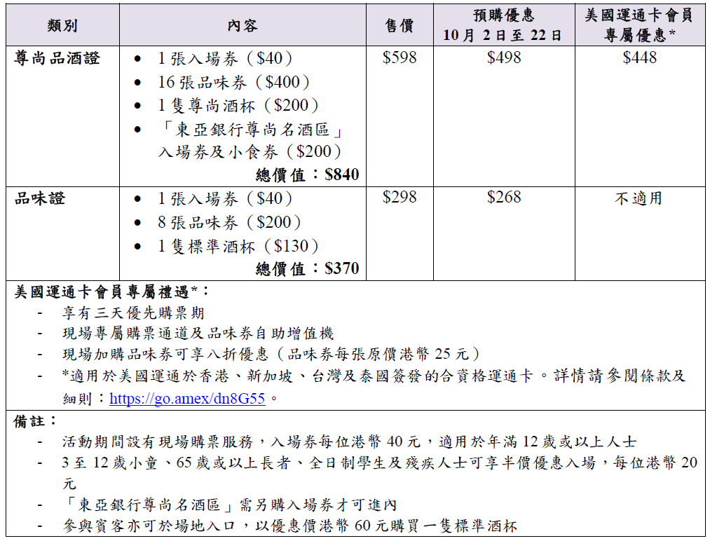 入場券、品味證及尊尚品酒證於10月2日(星期四)起於網上公開發售。持有美國運通卡的會員更專享三天(9月29日至10月1日)優先預購門票及一系列專屬優惠。