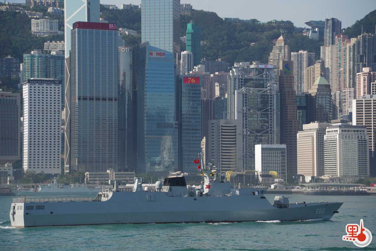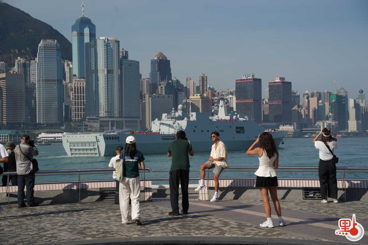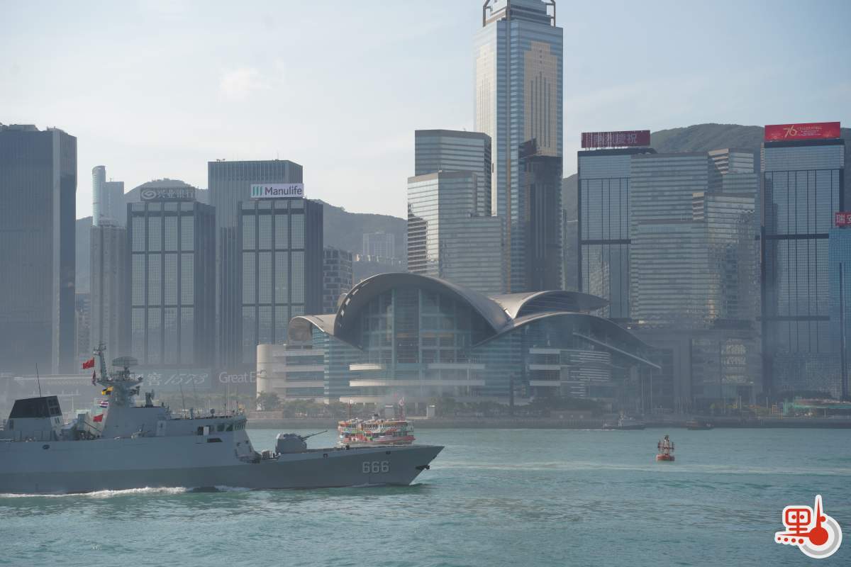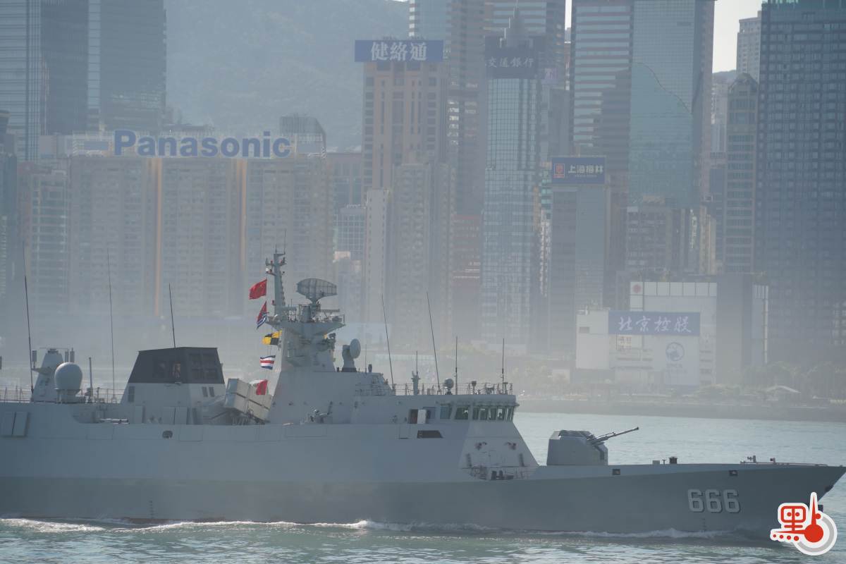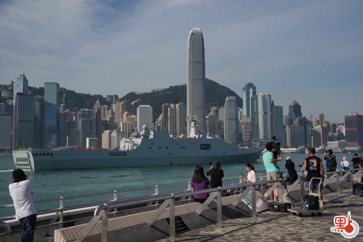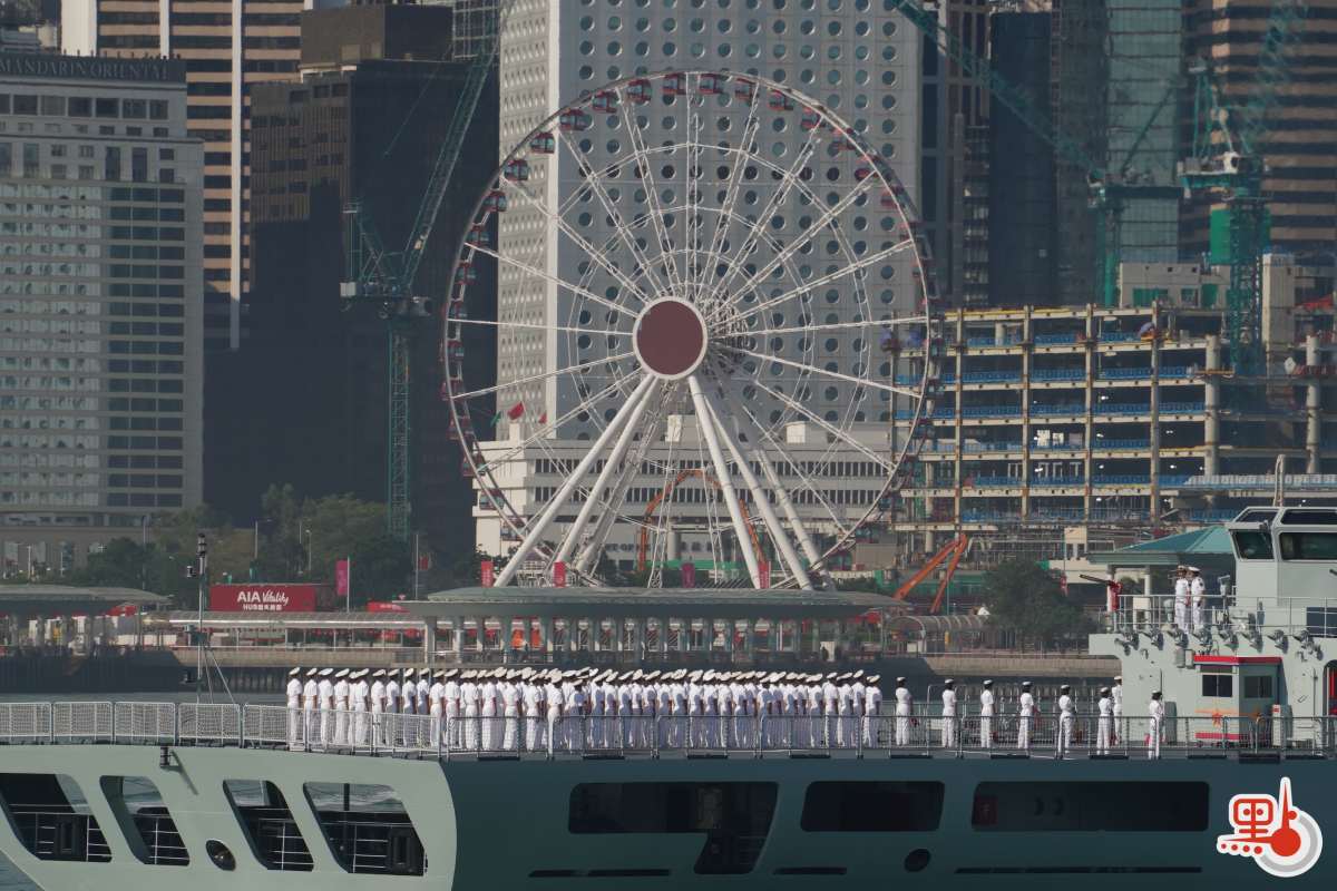 軍艦駛過維多利亞港,留下了軍艦與中環摩天輪同框等畫面;戚繼光艦上,有「向海圖強擔使命 愛民護港踐初心」「強軍逐夢向深藍 魚水情深滿香江」的橫幅;軍艦上,亦有英姿颯爽、氣宇軒昂的海軍,站姿筆直如松;還有不少遊客、市民藉此機會「打卡」,與軍艦合影。此外,在維多利亞港上空,有直升機懸掛五星紅旗和紫荊花旗飛過。