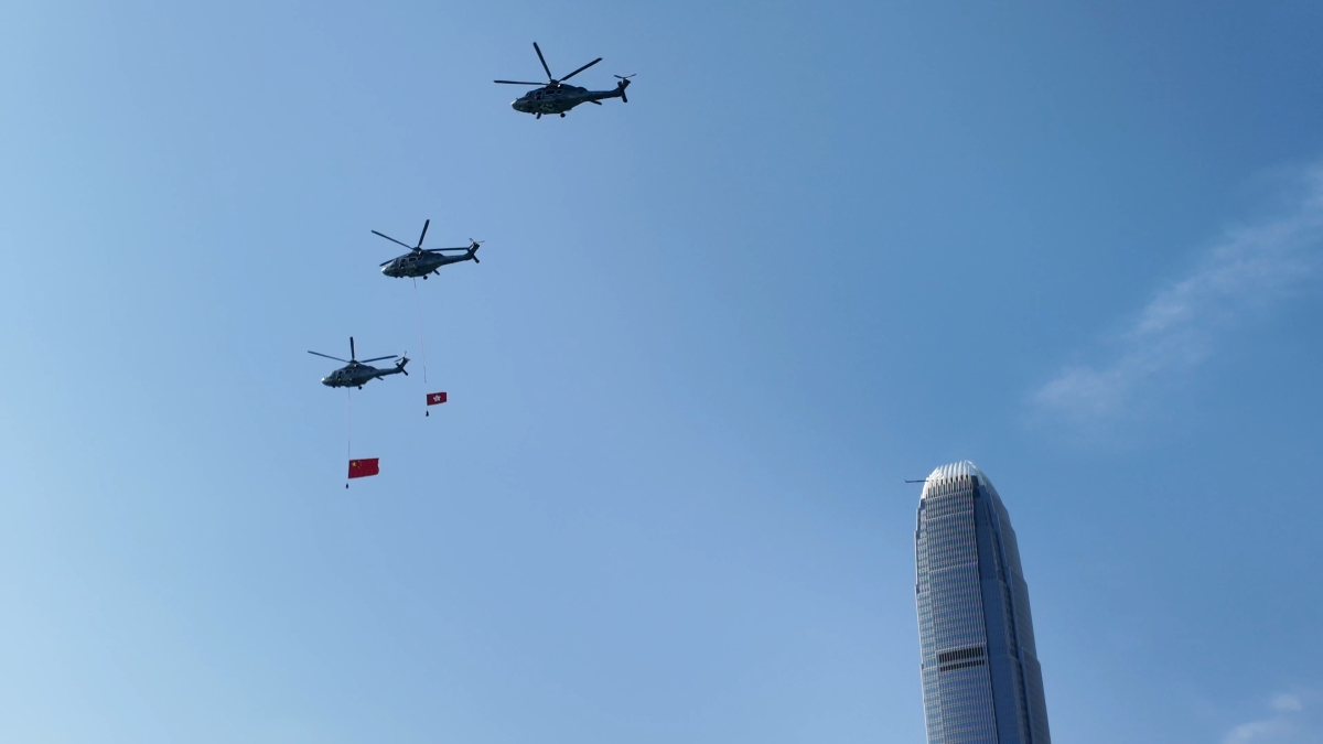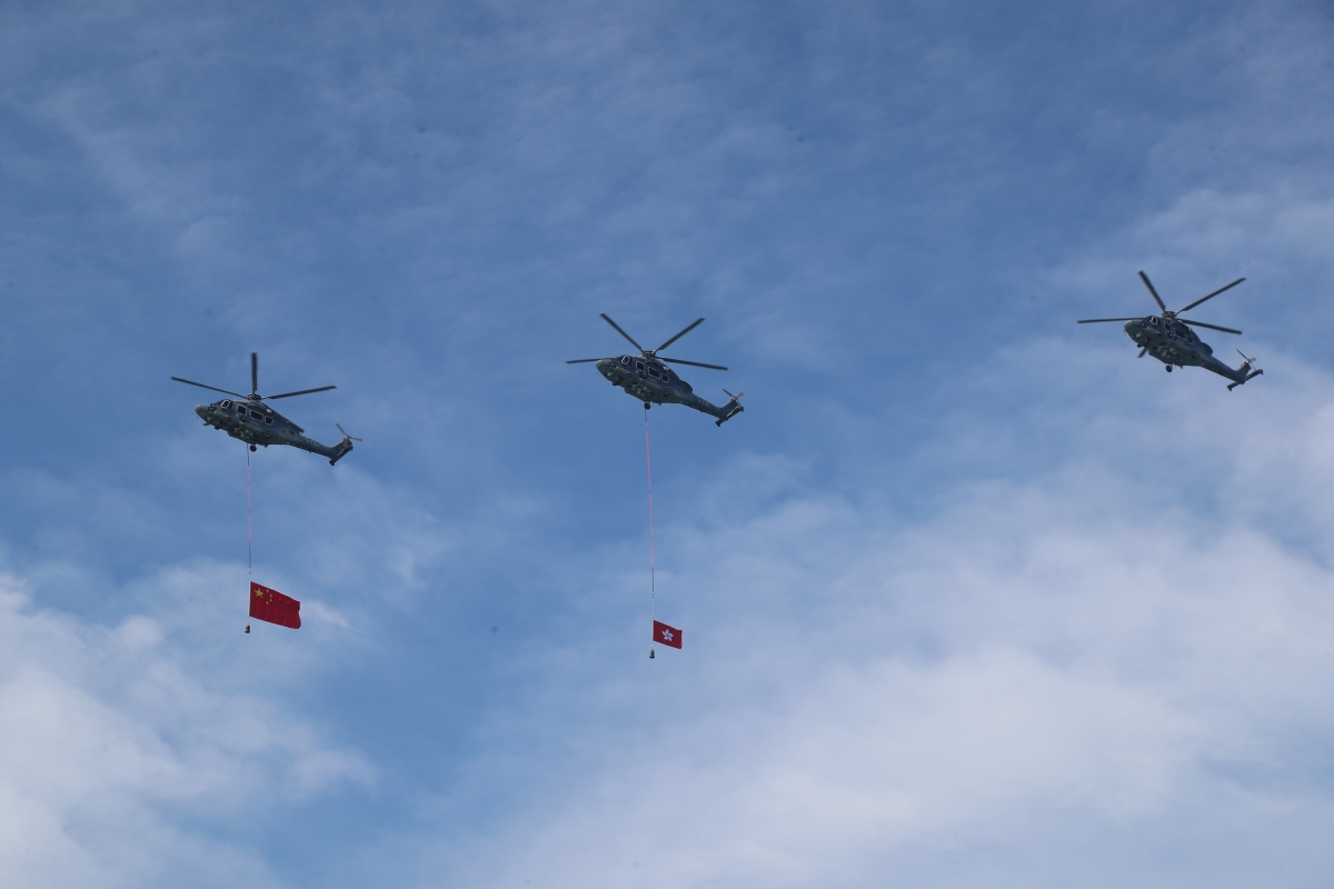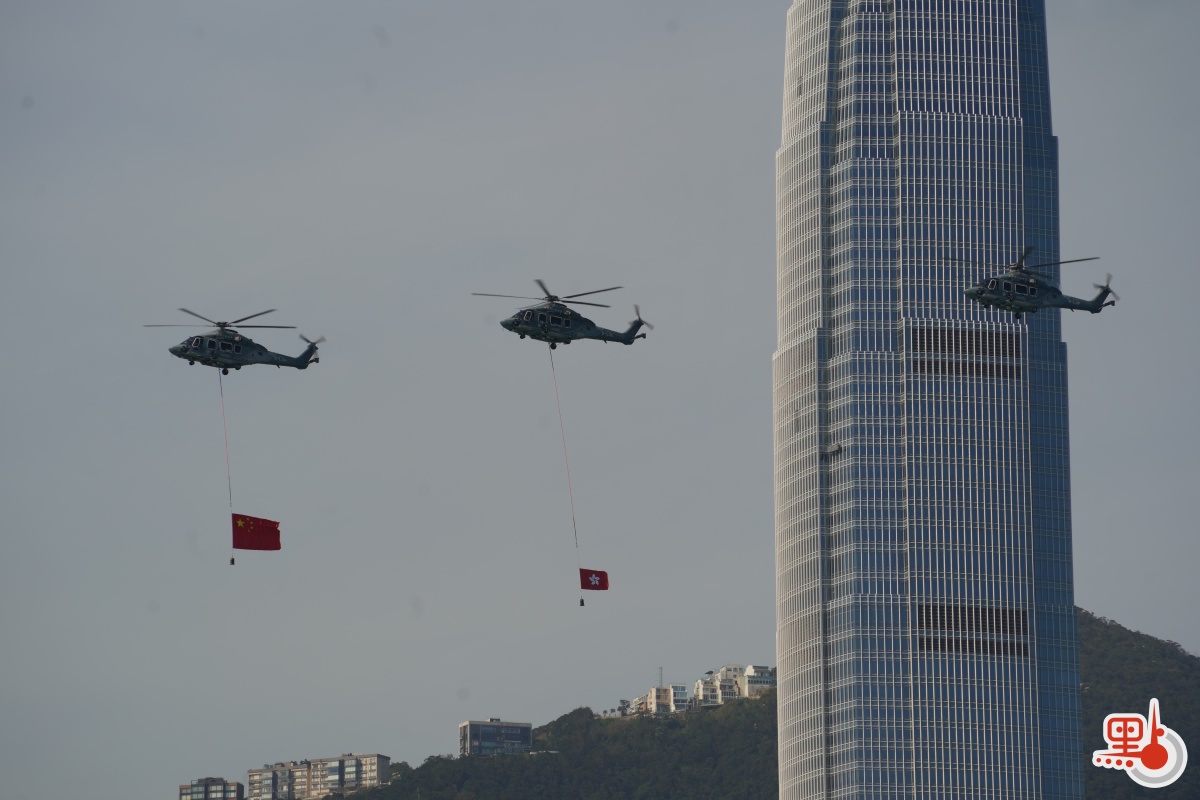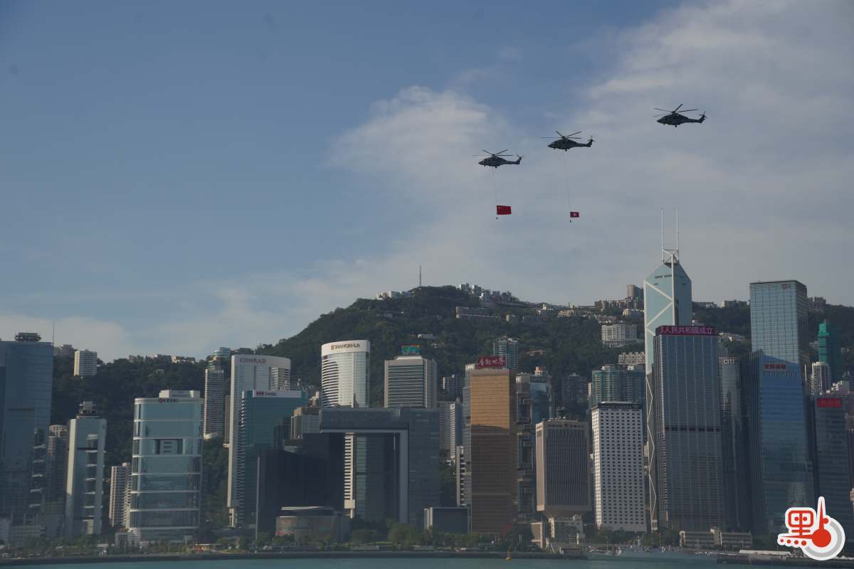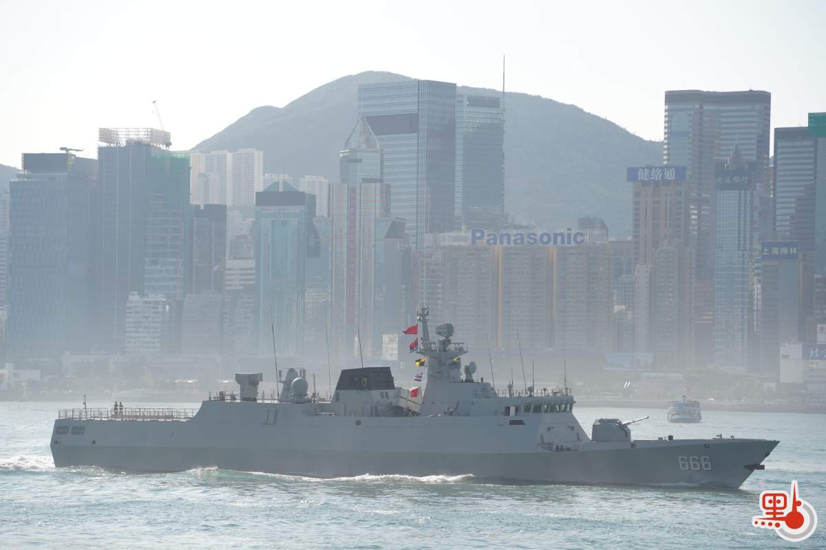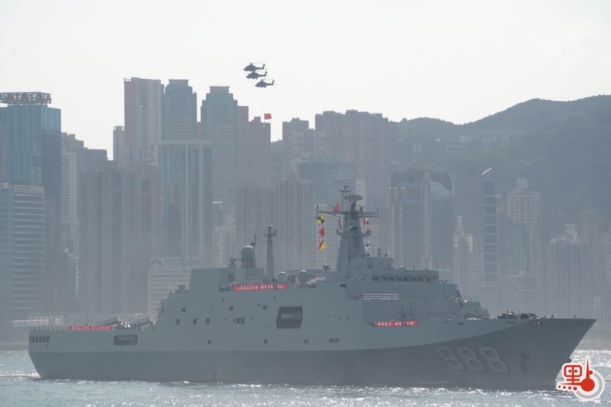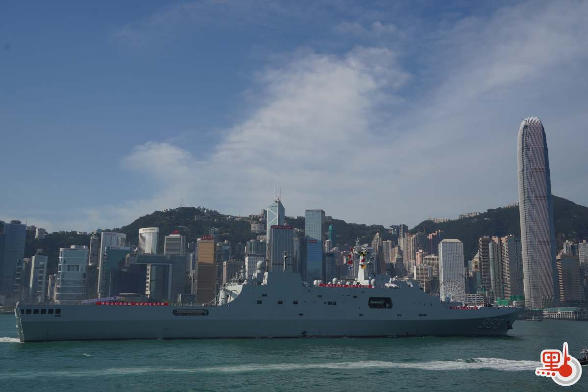 軍艦駛過維多利亞港,留下了軍艦與中環摩天輪同框等畫面;戚繼光艦上,有「向海圖強擔使命 愛民護港踐初心」「強軍逐夢向深藍 魚水情深滿香江」的橫幅;軍艦上,亦有英姿颯爽、氣宇軒昂的海軍,站姿筆直如松;還有不少遊客、市民藉此機會「打卡」,與軍艦合影。此外,在維多利亞港上空,有直升機懸掛五星紅旗和紫荊花旗飛過。