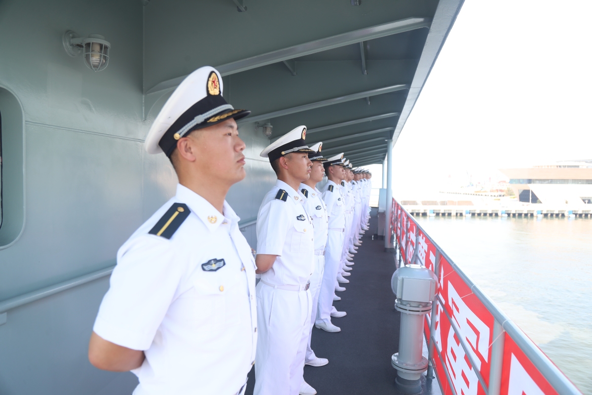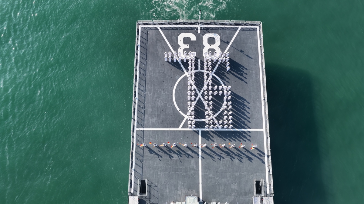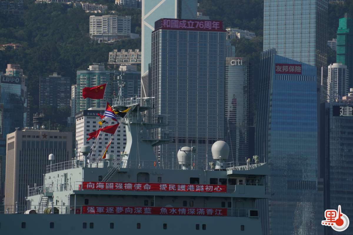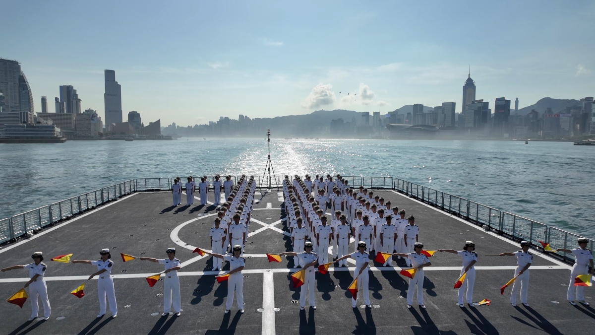 進入香港區界後,香港特區政府水警船護航,駐港部隊666軍艦引航。海軍學員在戚繼光艦甲板上採取變換隊形的形式擺出「中、國、心」造型,慶祝新中國成立76周年。