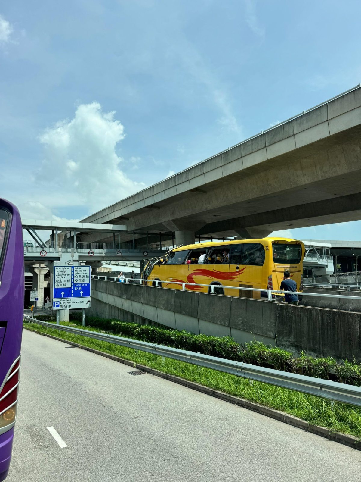 【點新聞報道】今日(30日)中午12時11分,一輛旅遊巴沿蓮麻坑路行駛,當駛至香園圍口岸私家車停車場入口的斜橋時,因車身過高,車頭直接撞上天橋底部。