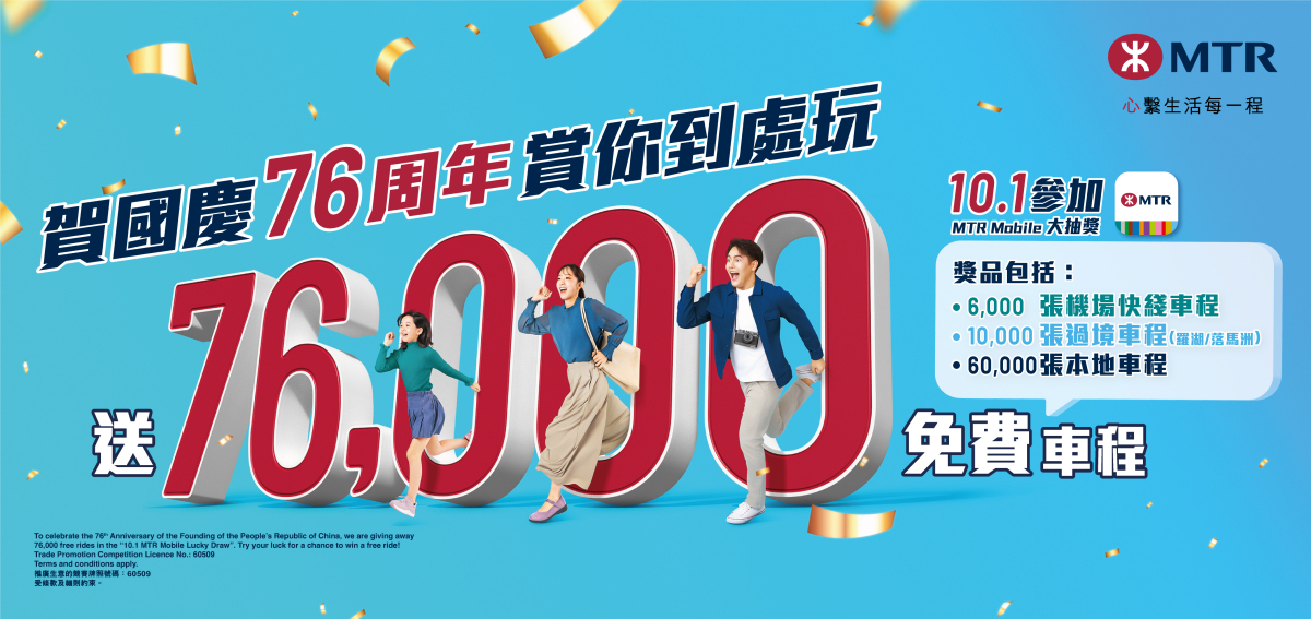 【點新聞報道】為慶祝中華人民共和國成立76周年,港鐵將於明日(10月1日)透過MTR Mobile送出共76000份單程車程,適用於本地鐵路綫、往返羅湖及落馬洲站過境路綫和機場快綫。只要登記成為港鐵會員,即可在國慶當日參與抽獎,即抽即知中獎與否。