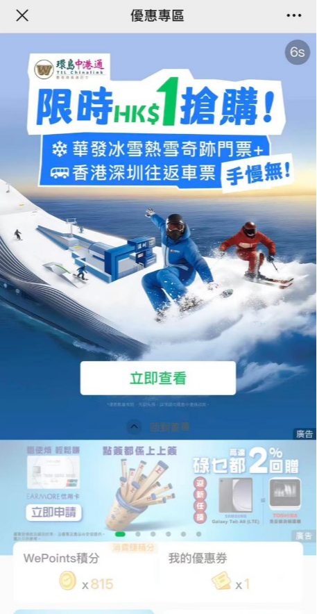 9月29日正式開幕的「深圳華發冰雪熱雪奇跡」,是大灣區最矚目的大型娛樂設施,佔地達10萬平方米,是全球最大室內滑雪場。內設5條專業賽事級別滑雪道、14項冰雪主題遊樂設施、大灣區首個室內潛水設施、五星級酒店等,提供集休閒度假與運動玩樂於一身的冰雪娛樂體驗。WeChat Pay HK率先攜手環島中港通與其合作,推出限時搶購優惠,用戶只需於10月1日早上10時,於WeChat Pay HK「優惠專區」進入「環島中港通」網站,即可以震撼價HK$1搶購原價為總值HK$618的套票,包括3小時初級道滑雪門票及「環島中港通」來回直通巴車票,適用於淡季、平日、旺季三個票種,讓用戶自由選擇。