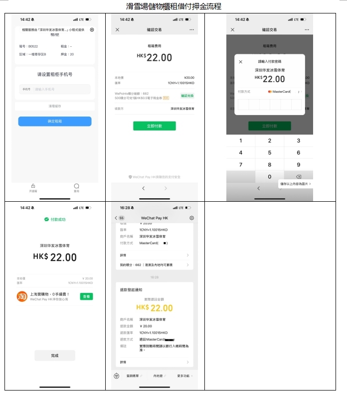 此外,滑雪場儲物櫃現已全面支援以微信App掃碼開啟。每次租借費用為¥20元,並支援使用WeChat Pay HK以港幣付款。使用完畢後,押金將自動退回,為用戶提供安全便捷的儲物服務。