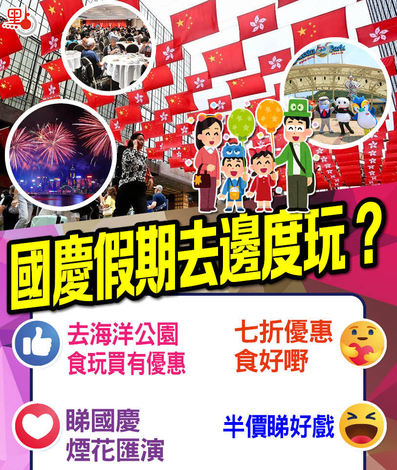 一系列國慶慶祝活動及優惠,包括交通優惠、戲院半價睇戲、逾千間食肆及商戶提供餐飲優惠,有連鎖集團已預告堂食全單7折。此外,市民亦可到熱門景點遊玩,海洋公園、昂坪360都有推出票價優惠,而在沙田馬場舉行的國慶賽馬日,市民可免費進入沙田及跑馬地馬場公眾席,享有購物優惠。另外,康文署亦會開放多項收費康樂及文化設施予市民免費使用。
