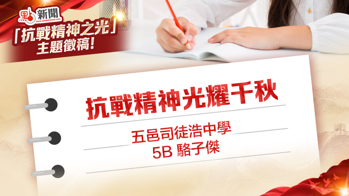 【編者按】今年是中國人民抗日戰爭暨世界反法西斯戰爭勝利80周年,日前恢弘的閱兵儀式,是否也讓你心潮澎湃久久不能平靜?儀式之外,那段深刻入骨的民族苦難與可歌可泣的英雄史詩,更需被永遠銘記與傳承。為此,點新聞「學生園地」早前開啟「抗戰精神之光」主題徵稿,今日刊發的是來自五邑司徒浩中學5B駱子傑的佳作《抗戰精神光耀千秋》,讓我們一同重溫崢嶸歲月,珍視來之不易的和平。